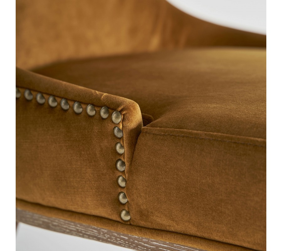 Po obvode sedacej časti a zadnej strany opierky je viditeľná dekoratívna línia kovových nitov, ktoré zvýrazňujú čalúnenie a pripomínajú klasické remeselné spracovanie s glamour detailom. Konštrukcia a nožičky sú vyrobené z masívneho dreva s viditeľnou kresbou letokruhov a jemnou bielou patinou, ktorá kontrastuje s výrazným odtieňom poťahu. Nožičky sú rovné, hranato tvarované a mierne sa zužujú smerom nadol, čo zabezpečuje stabilitu aj moderný vzhľad.
