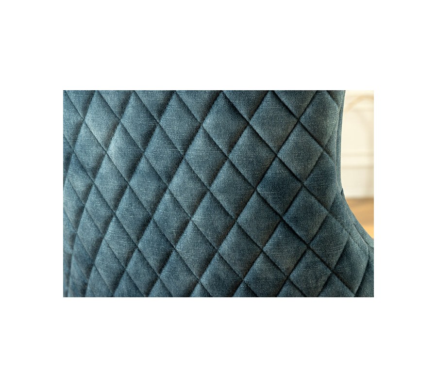 Klasická jedálenská stolička Modern Barock pôsobí honosne a reprezentatívne vďaka zamatovému poťahu v tmavomodrej farbe. Chrbtová opierka je elegantne vykrojená a zdobená prešívaním v diamantovom vzore, do ktorého sú vsadené dekoratívne gombíky v rovnakej farbe ako poťah. Sú tam 2 typy prešívania zo zadnej časti opierky diamantové a z prednej časti opierky chesterfield s gombíkmi.