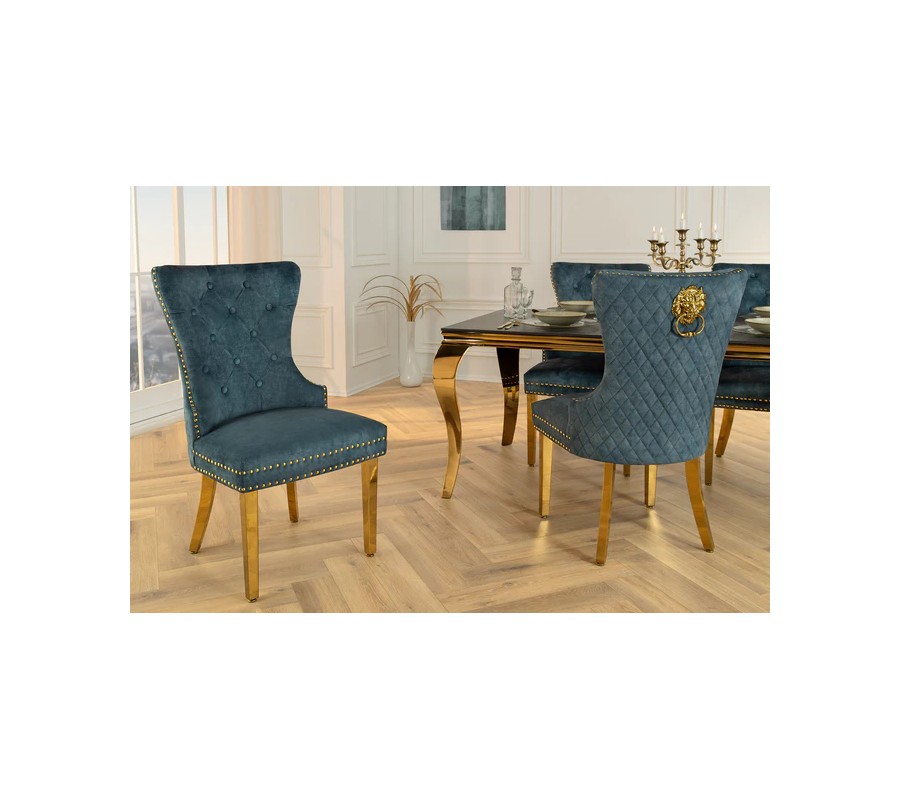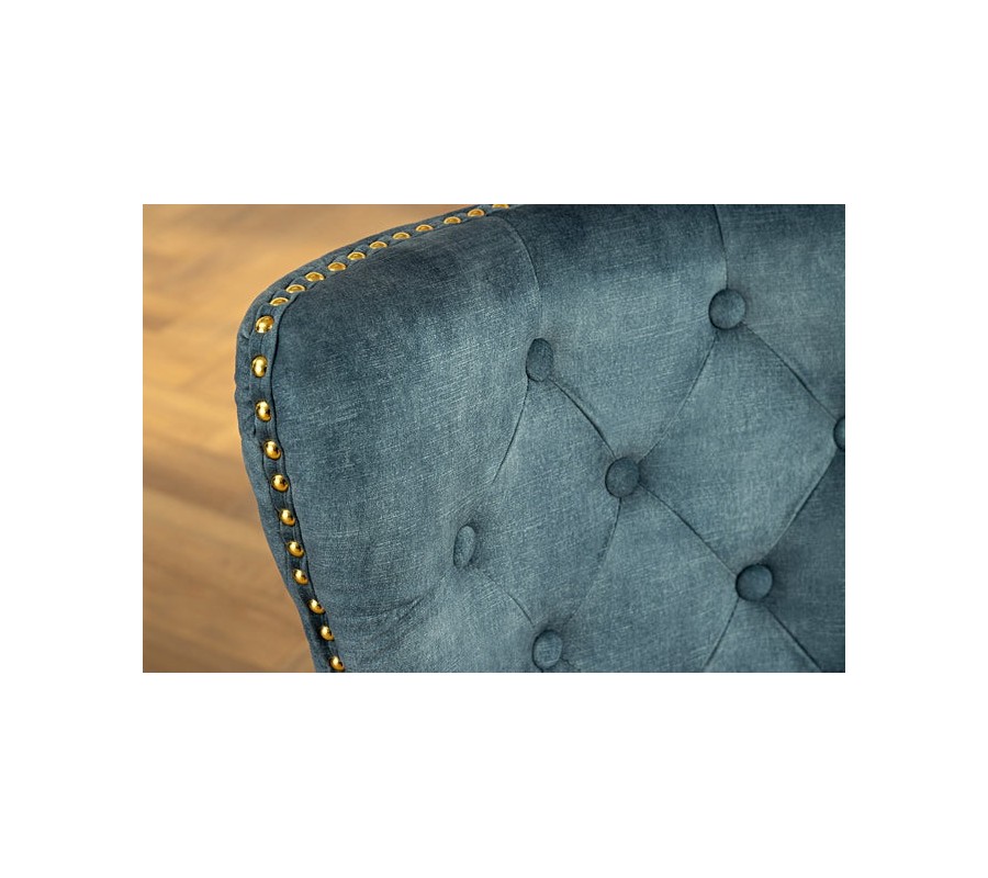 Glamour čalúnená prešívaná zamatová modrá jedálenská stolička Modern Barock so zlatými kovovými nožičkami a klopkadlom 98 cm