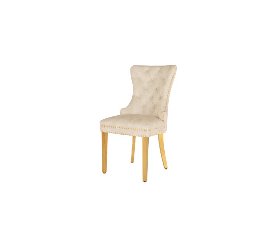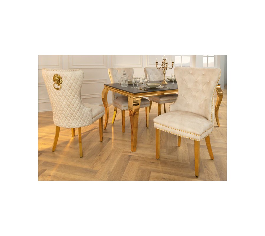 Klasická glamour jedálenská stolička Modern Barock pôsobí luxusne a elegantne vďaka zamatovému poťahu v krémovo béžovej farbe. Chrbtová opierka má výrazné prešívanie v diamantovom vzore, do ktorého sú vsadené dekoračné gombíky, čo jej dodáva noblesný vzhľad. Sú tam 2 typy prešívania zo zadnej časti opierky diamantové a z prednej časti opierky chesterfield s gombíkmi.