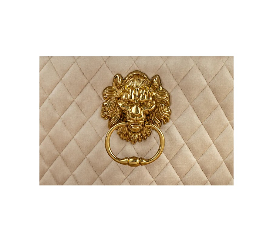 Po obvode celej stoličky – v prednej časti sedadla aj po bokoch operadla – sa nachádzajú dekoratívne zlaté nity, ktoré zdôrazňujú jej štýlový charakter. Zadná strana operadla je navyše doplnená o klopkadlo v zlatej farbe v podobe hlavy leva, ktoré je zároveň praktickým aj dekoratívnym prvkom. Operadlo je elegantne vykrojené, čo vytvára pôvabnú siluetu a podporuje pohodlné sedenie.