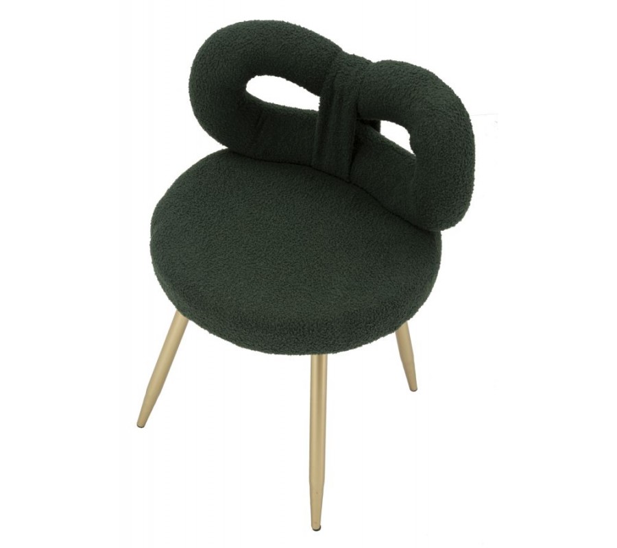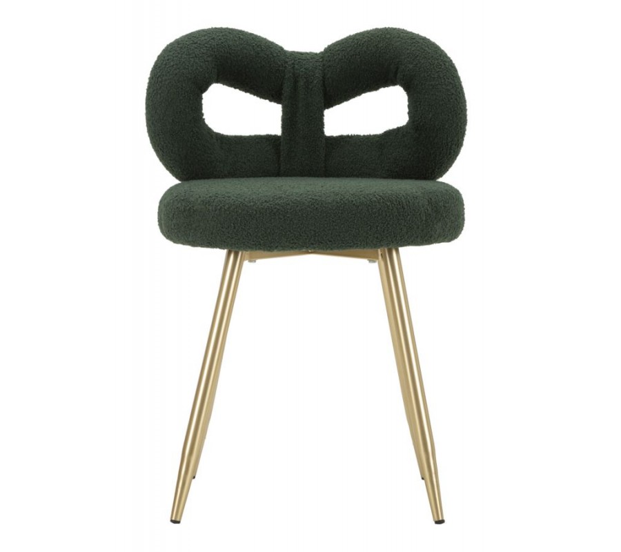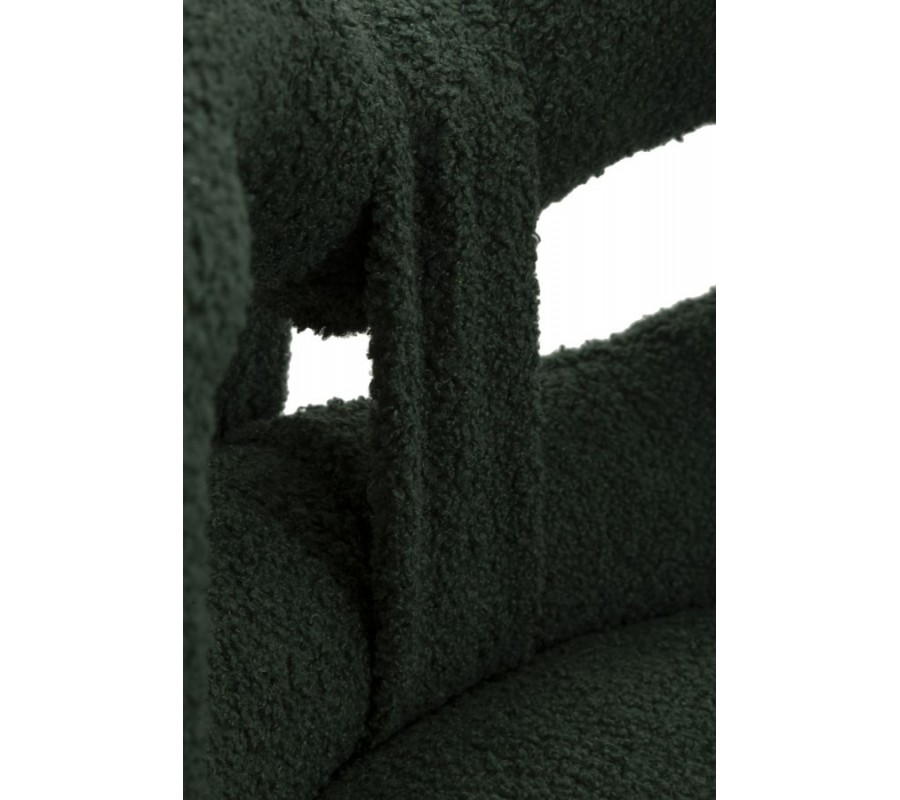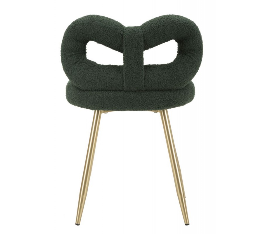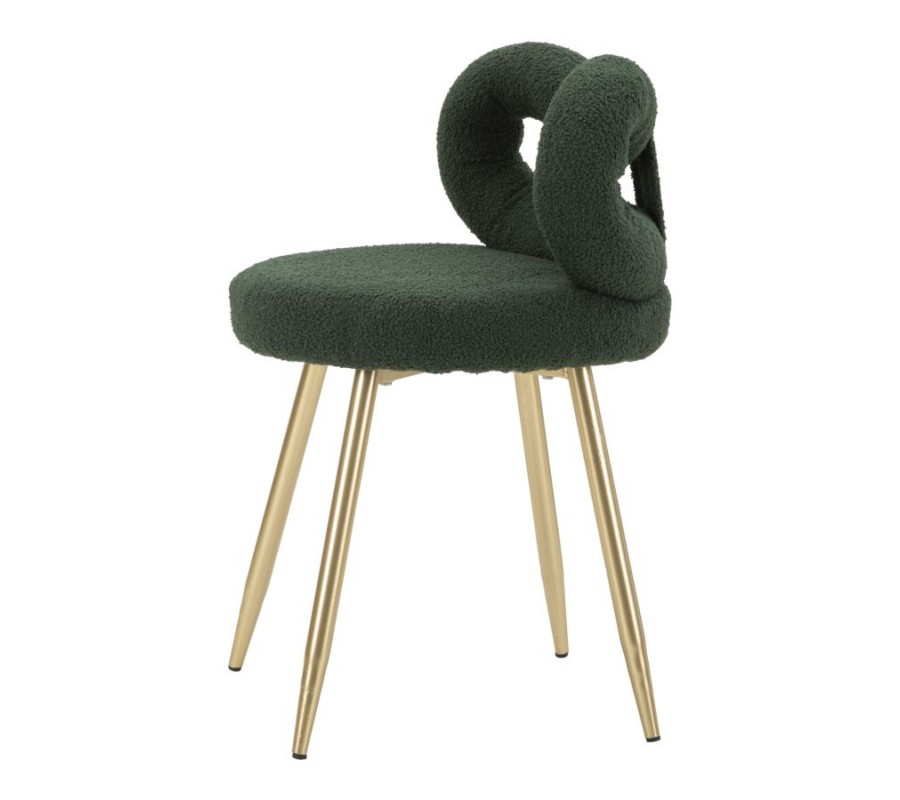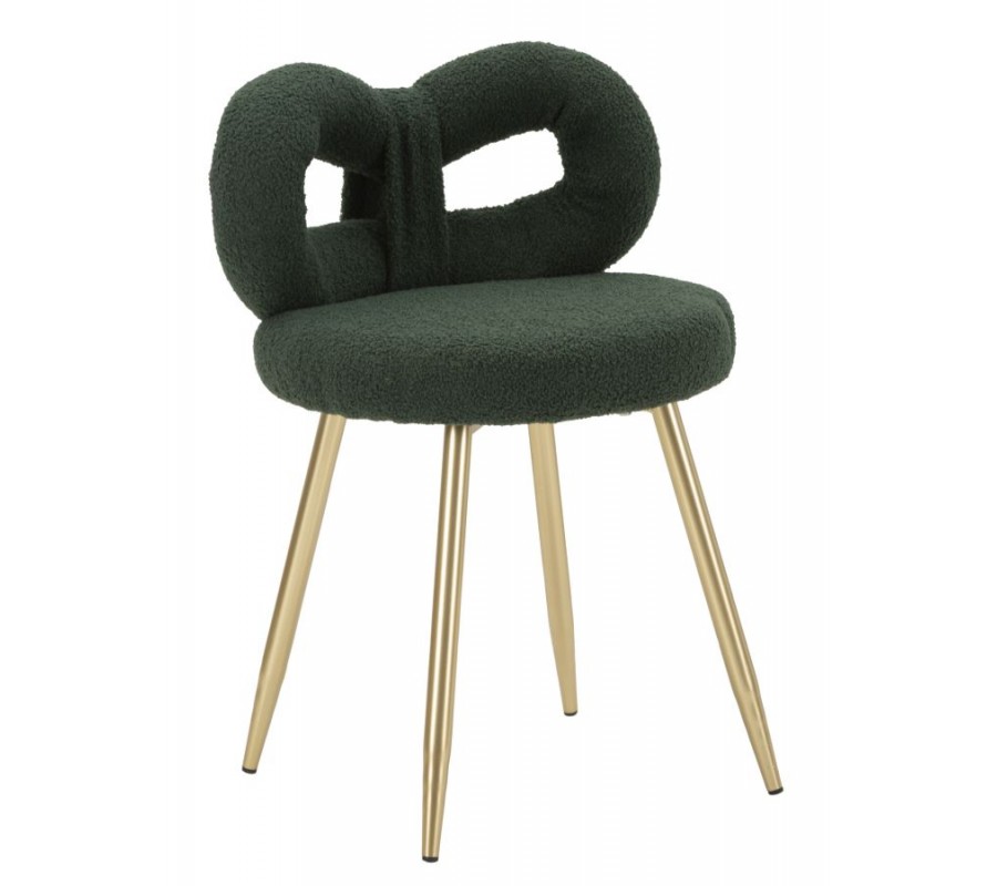 Moderná art deco jedálenská stolička Janar v tmavozelenom prevedení upúta netradičným dizajnom a elegantnými detailmi. Bouclé poťah v sýtej tmavozelenej farbe vytvára bohatý vizuálny dojem a zároveň ponúka mäkký a pohodlný povrch na sedenie.