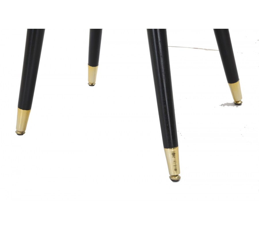 Čierne drevené nožičky sú mierne zúžené a ukončené lesklým zlatým detailom, ktorý vytvára kontrast so zamatovým sedákom a podčiarkuje jej art deco charakter. Nohy sú pevne spojené so sedadlom, čo zabezpečuje stabilitu aj pri častom používaní.