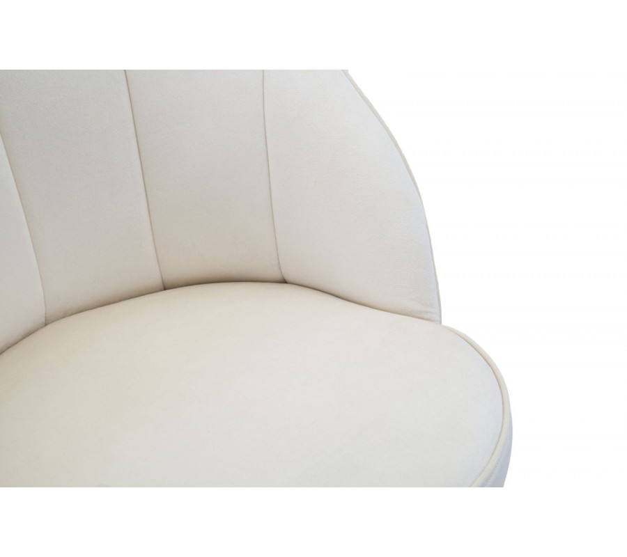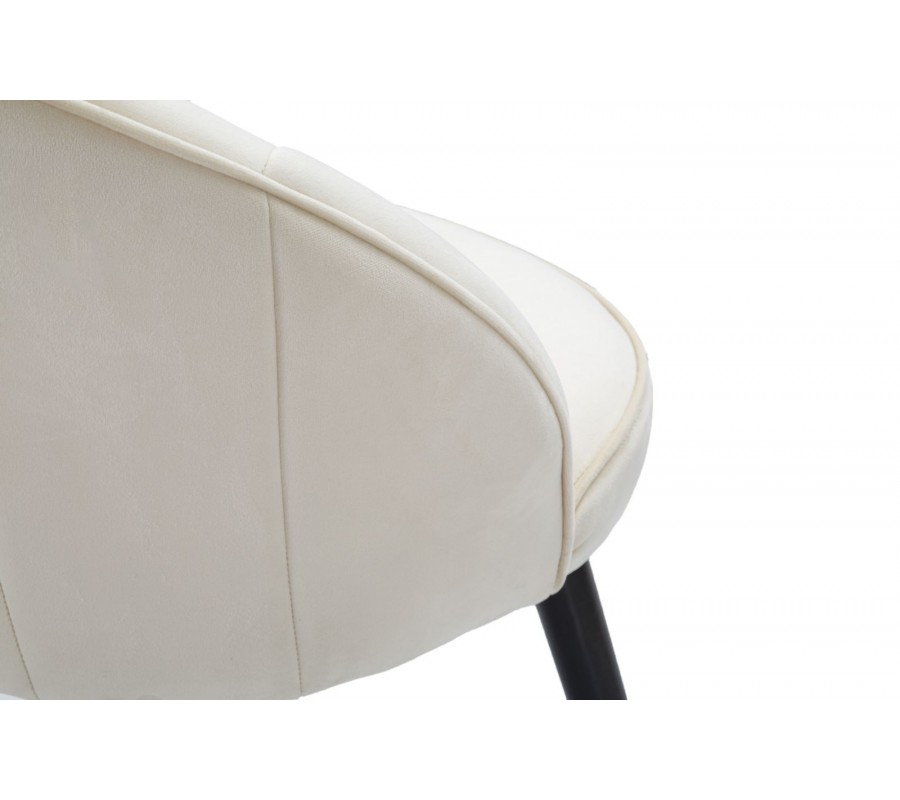 Jedálenská stolička Elveria v krémovom zamatovom prevedení je elegantným doplnkom pre každý interiér s dôrazom na luxus a štýl. Vďaka svojmu okrúhlemu tvaru operadla, ktoré jemne obopína chrbát a boky, pôsobí stolička kompaktne a zároveň pohodlne. Vertikálne prešívanie po vnútornej strane operadla dodáva stoličke jemný dekoratívny detail, ktorý podčiarkuje kvalitu spracovania.