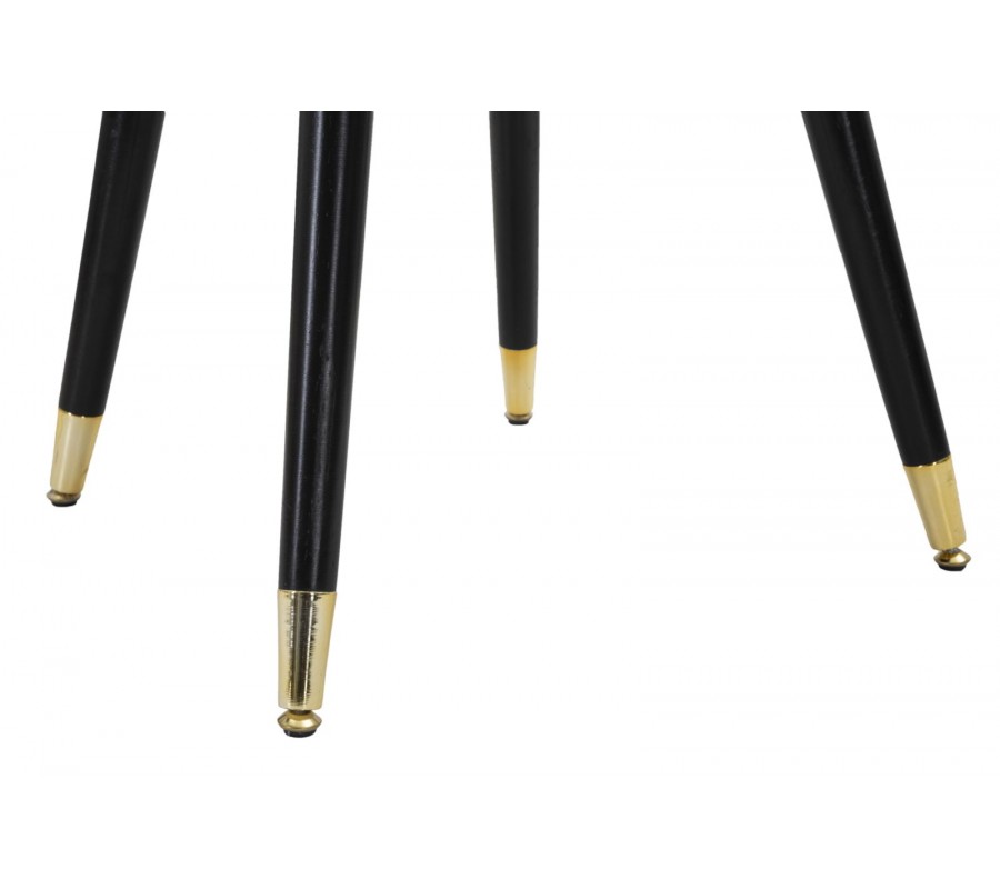 Stolička stojí na štyroch drevených nožičkách v čiernej farbe, ktoré sú zospodu zakončené zlatými kovovými návlekmi – tie slúžia ako efektný dizajnový prvok aj ochrana proti poškodeniu. Nohy sú mierne rozšírené smerom do strán, čo zvyšuje stabilitu a bezpečnosť.