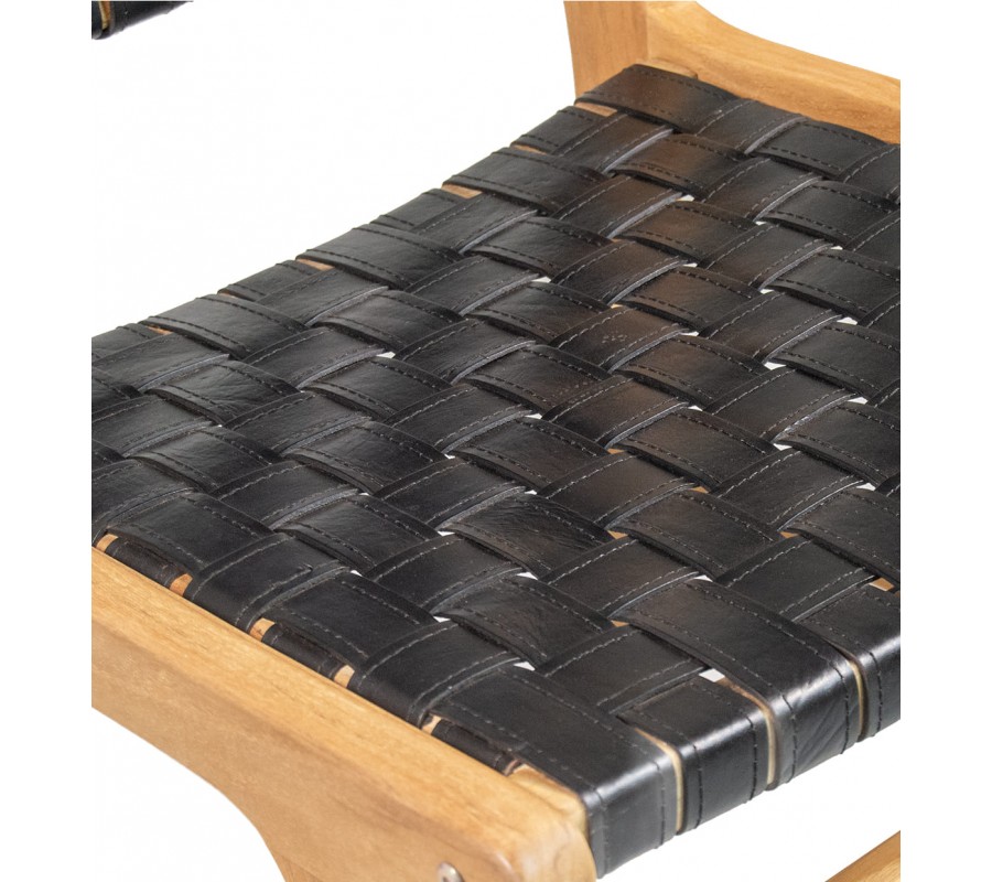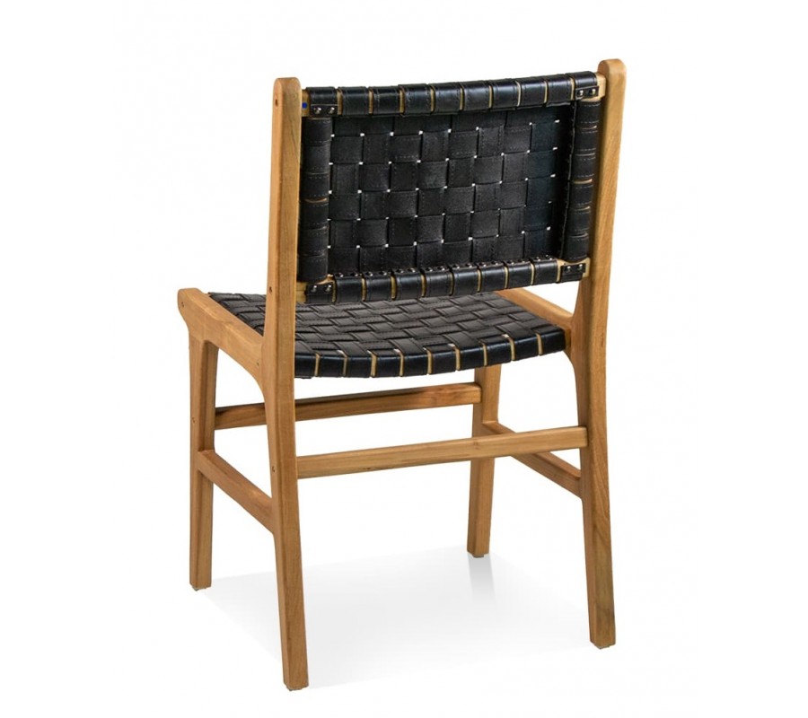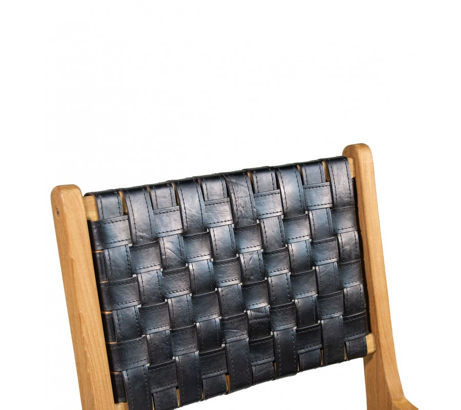 Luxusná koloniálna jedálenská stolička Cleo s výpletom z pravej kože v čiernej farbe a hnedým teakovým rámom 88 cm