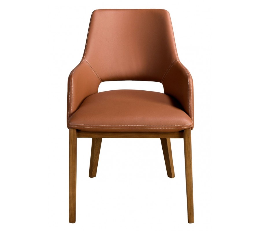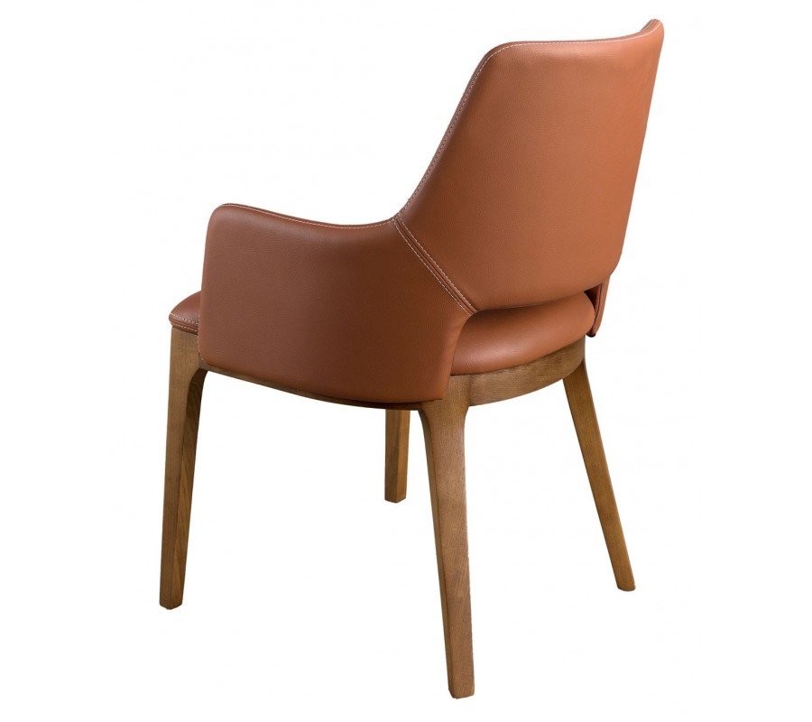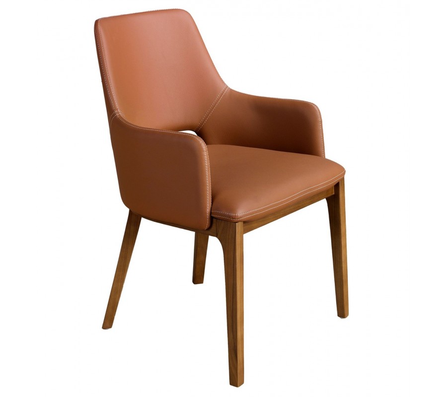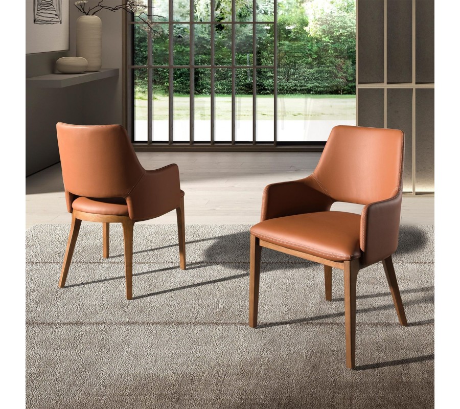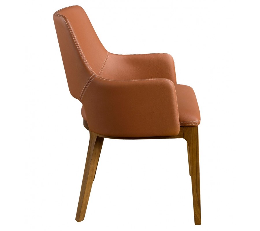 Luxusná moderná kožená jedálenská stolička Vita Naturale v koňakovej hnedej farbe s opierkami na ruky a drevenými nohami 83 cm