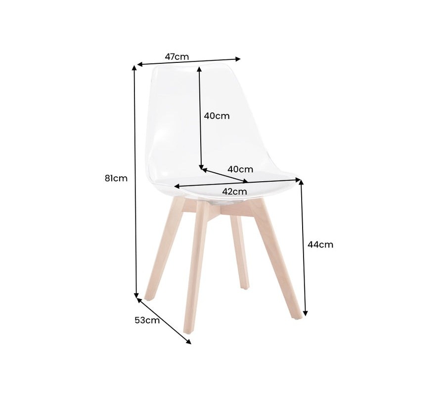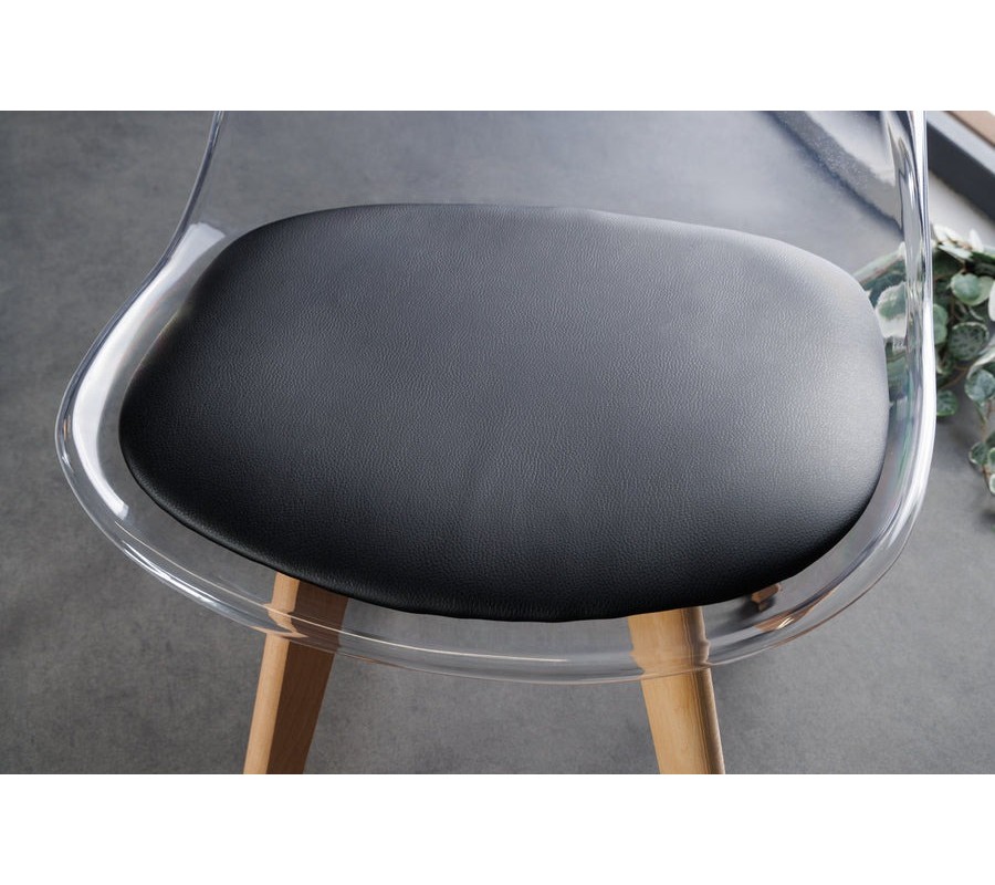 Moderná jedálenská stolička Scandi v sebe spája škandinávsku jednoduchosť a vizuálnu ľahkosť. Jej transparentné operadlo z pevného a odolného plastu, ktorý je nenáročný na údržbu, je elegantne zaoblené a pokrýva celú vrchnú časť chrbta. Plynulo prechádza do integrovaného čierneho sedadla, ktoré je potiahnuté hladkou ekokožou. Tento kontrast medzi priehľadnou konštrukciou a plným farebným akcentom zvyšuje komfort a zároveň vytvára decentný vizuálny efekt.