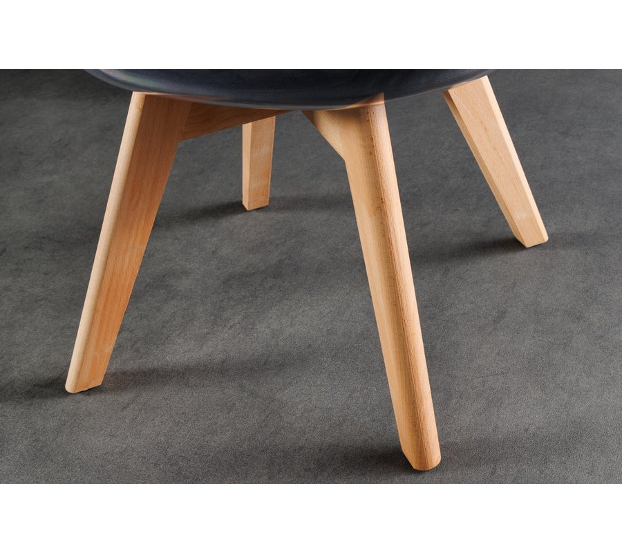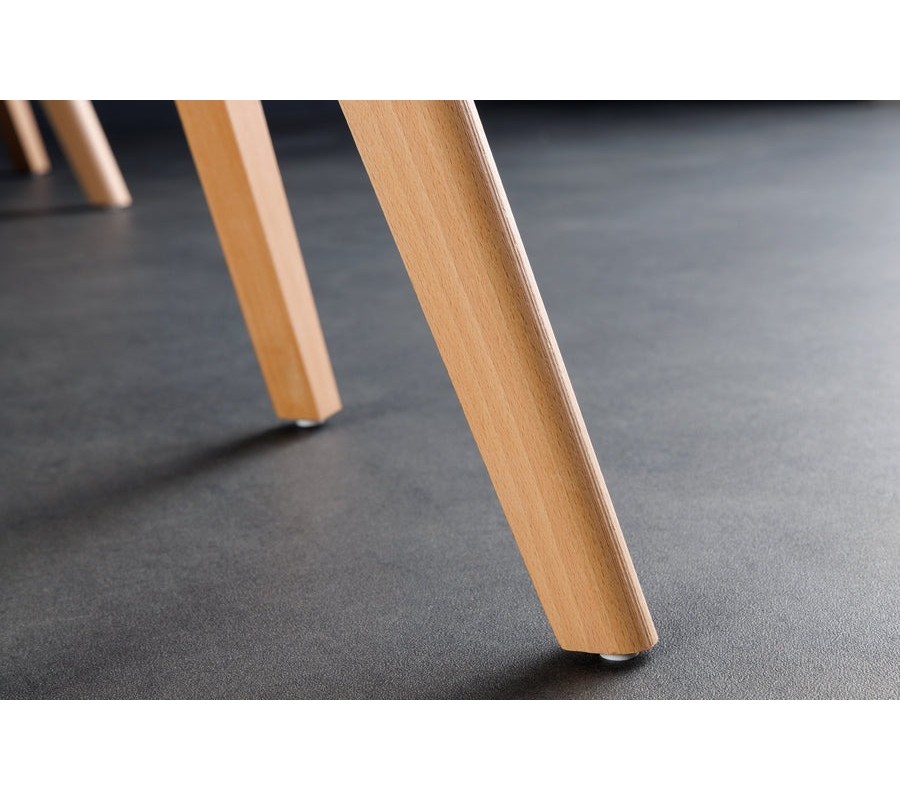 Masívne bukové nožičky v jemnom svetlohnedom odtieni sú tvarované úzko a smerujú mierne von, čo zaručuje stabilitu aj odľahčený vzhľad. Ich hladký lakovaný povrch zvýrazňuje prirodzenú kresbu dreva a esteticky ladí s čistými líniami sedacej časti. Absencia opierok na ruky podporuje vzdušný a kompaktný dizajn.