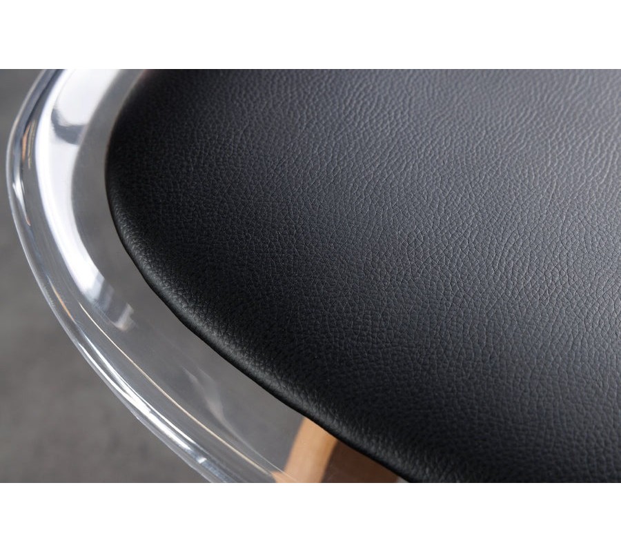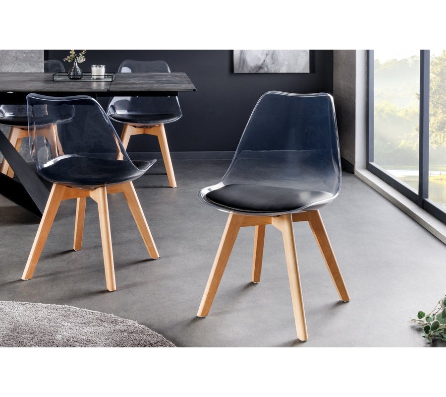 Škandinávska stolička Scandi s priehľadným plastovým operadlom a čiernym koženým sedadlom na bukových nožičkách 81 cm