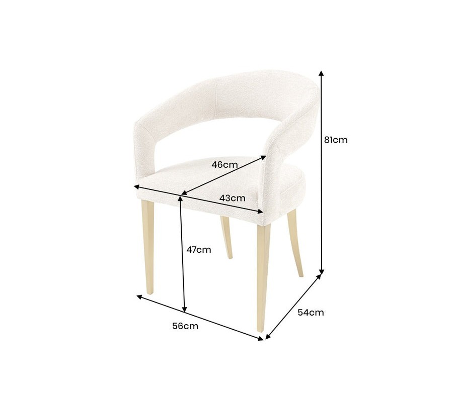 Štíhle kovové nožičky v zlatej farbe majú kónický tvar, ktorý dodáva stoličke vizuálnu ľahkosť a zároveň zaručuje stabilitu. Zlatý odtieň základne pôsobí luxusne a harmonicky dopĺňa svetlý poťah, čím podčiarkuje glamour charakter celého dizajnu.