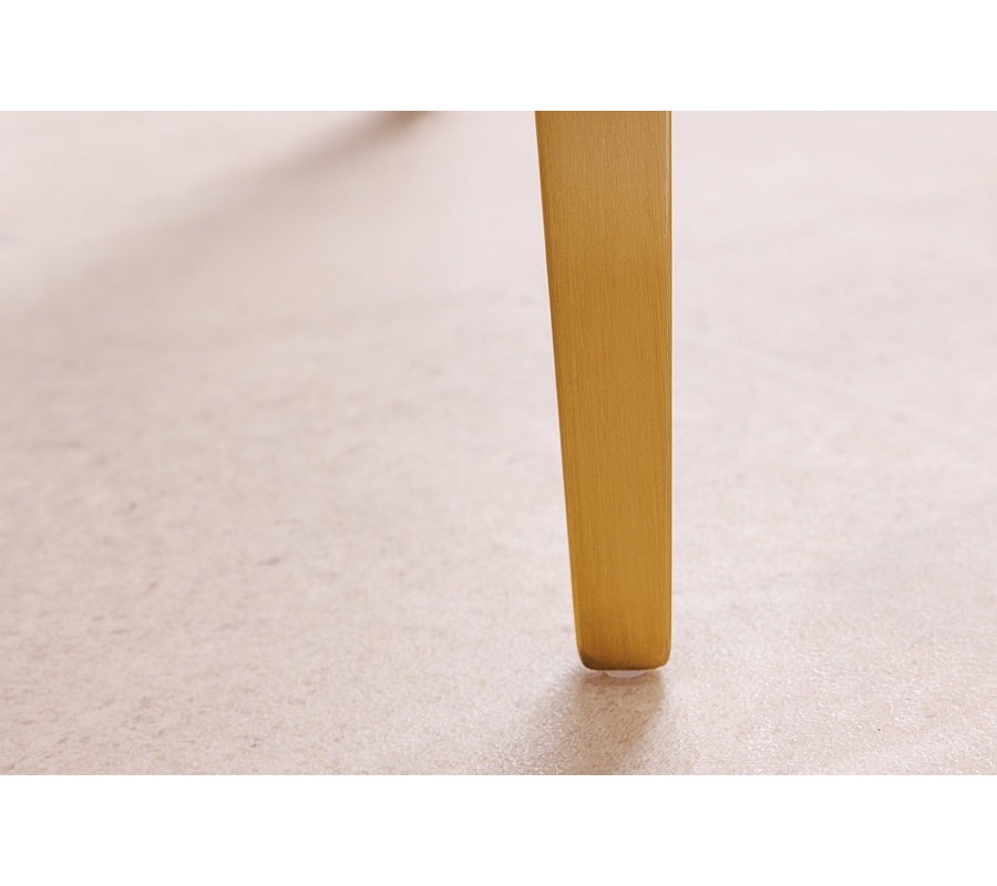 Štíhle kovové nožičky v zlatej farbe kontrastujú so sedacou časťou a dodávajú stoličke exkluzívny nádych. Jemne kónický tvar nôh zabezpečuje stabilitu a odľahčuje celkový vzhľad, čím stolička pôsobí ľahko a elegantne.