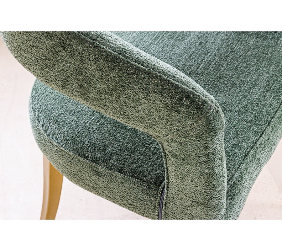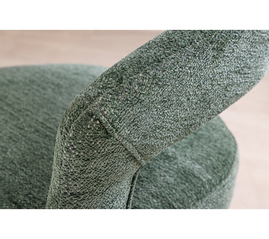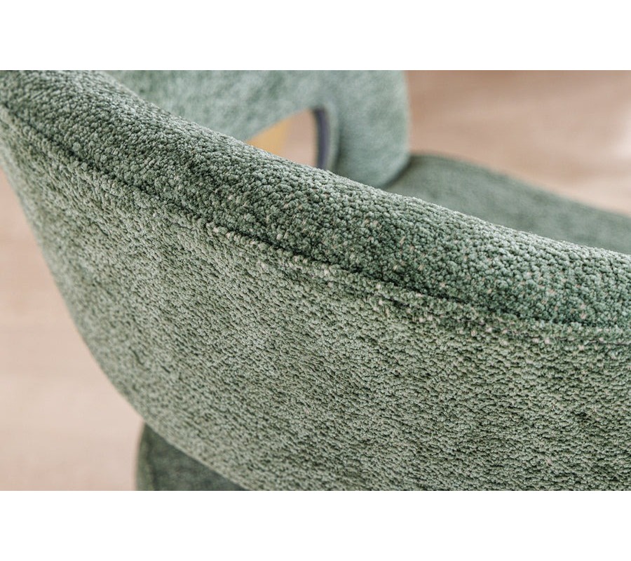 Sedadlo je potiahnuté kvalitnou textilnou látkou v zelenej farbe, ktorá vnáša do interiéru sviežosť a prírodný nádych. Povrchová textúra poťahu je jemne štruktúrovaná, príjemná na dotyk a v kombinácii s výrazným odtieňom zelenej vytvára hrejivý a zároveň moderný efekt.