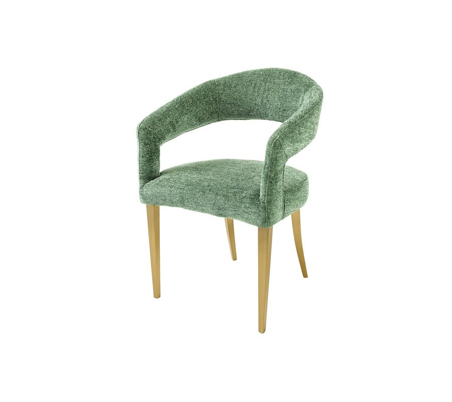 Štýlová čalúnená glamour zelená jedálenská stolička Lunit s vykrojeným sedadlom a zlatými kovovými nožičkami 81 cm