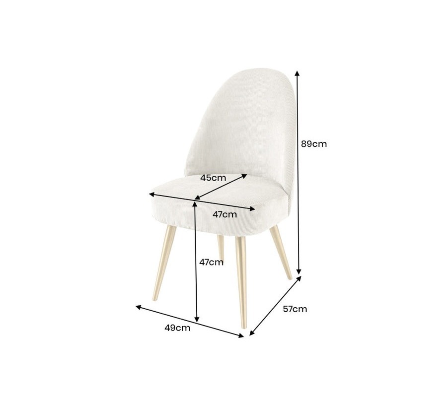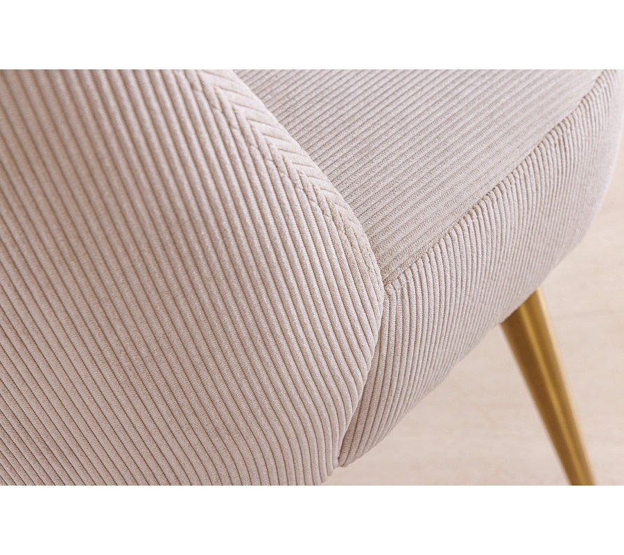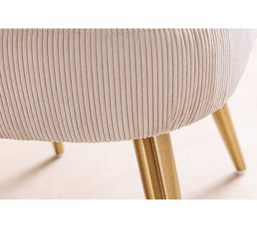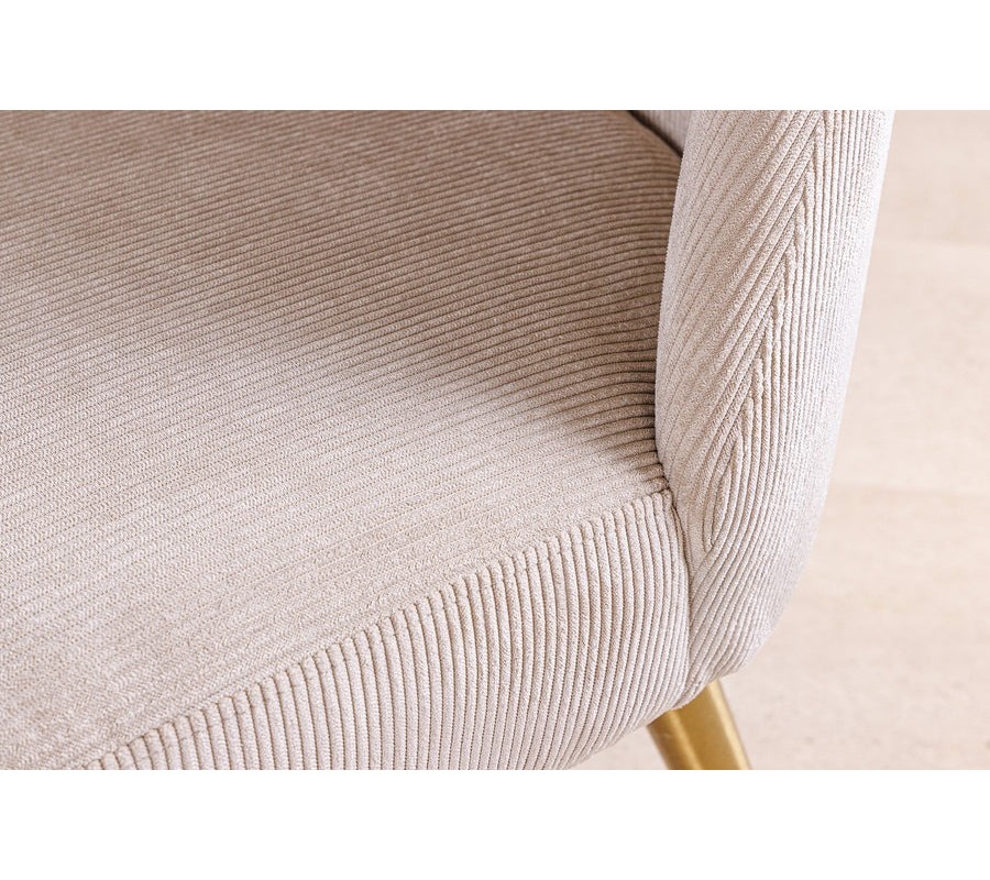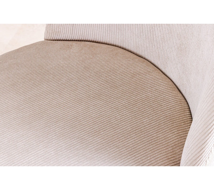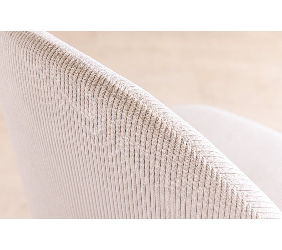 Sedadlo je potiahnuté menčestrovým vrúbkovanou látkou v béžovej farbe, ktorá kombinuje mäkkosť na dotyk s decentnou štruktúrou. Jemné vertikálne vrúbky pridávajú povrchu dynamiku a vizuálnu hĺbku, čím stolička pôsobí sofistikovane a zaujímavo aj z blízka. Svetlý béžový odtieň je neutrálny, no zároveň teplý, vďaka čomu stolička ľahko zapadne do rôznych farebných konceptov a elegantne zjemní priestor.
