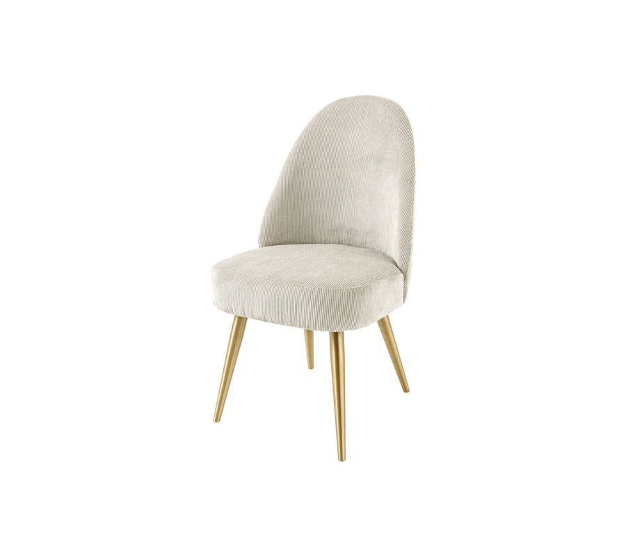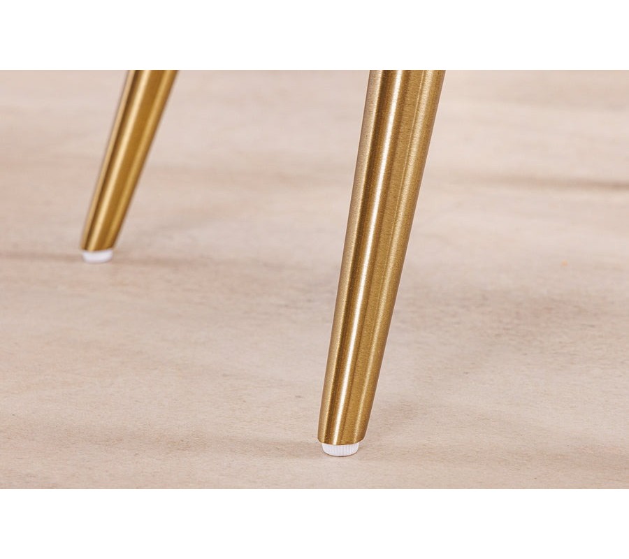 Štíhle kónické nožičky vyrobené z kovu v zlatej šampanskej farbe pridávajú stoličke nádych luxusu a v kombinácii s čalúnením vytvárajú harmonickú rovnováhu medzi jemnosťou a výraznosťou. Jemne rozšírené zakončenia nôh zabezpečujú stabilitu a dotvárajú vizuálne odľahčený a zároveň pevný dojem.