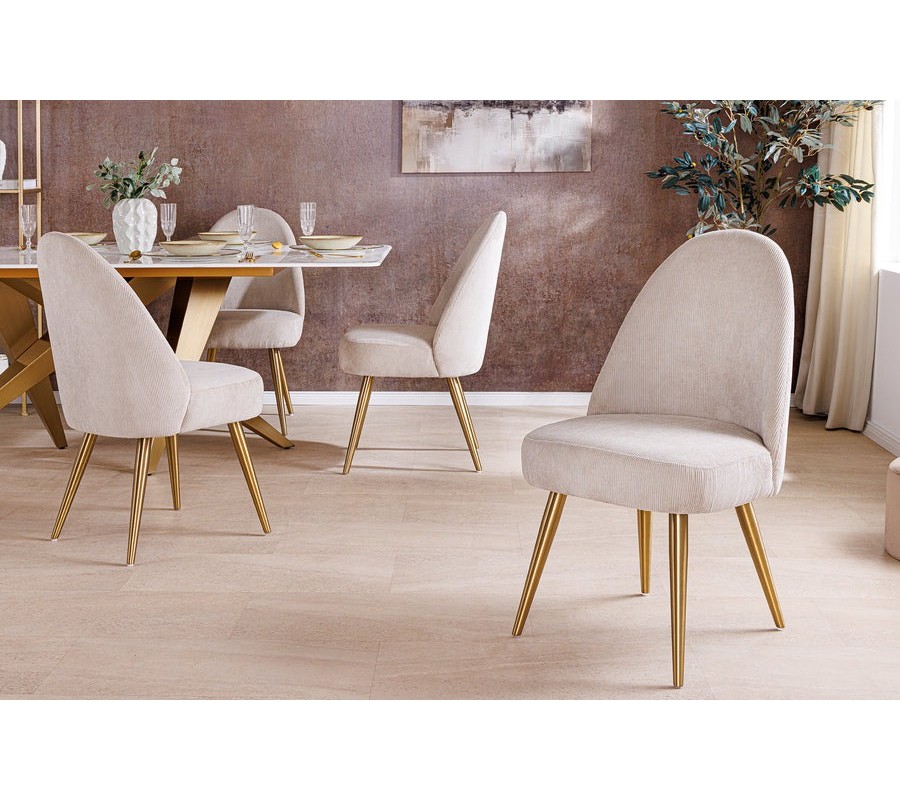 Moderná art deco čalúnená béžová jedálenská stolička Jana s menčestrovým poťahom s kovovými zlatými nožičkami 89 cm