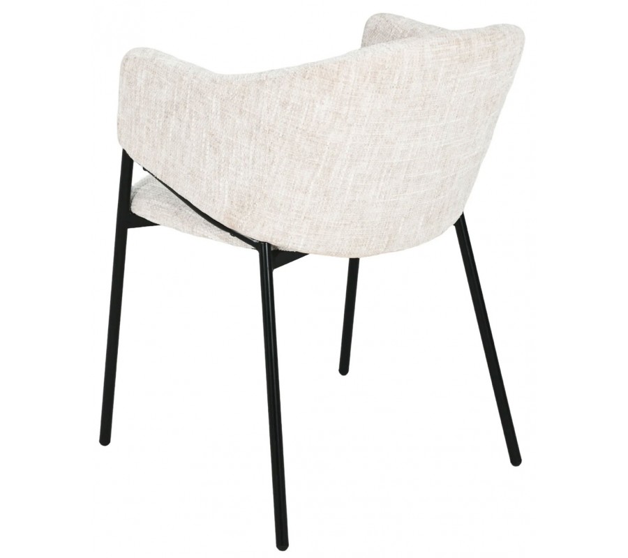 Stolička má výrazne zaoblenú chrbtovú časť, ktorá poskytne príjemné opretie. Zadná časť je vyvýšená a po stranách plynule prechádza do nižších opierok na ruky. Zaujímavým dizajnovým detailom je, že bočné opierky sú v spodnej časti nadvihnuté a silueta tak pôsobí vzdušným dojmom.