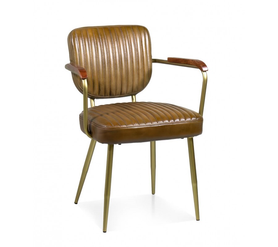 Retro hnedá jedálenská stolička Denver s koženým poťahom s vertikálnym prešívaním s opierkami so zlatými nožičkami 97 cm