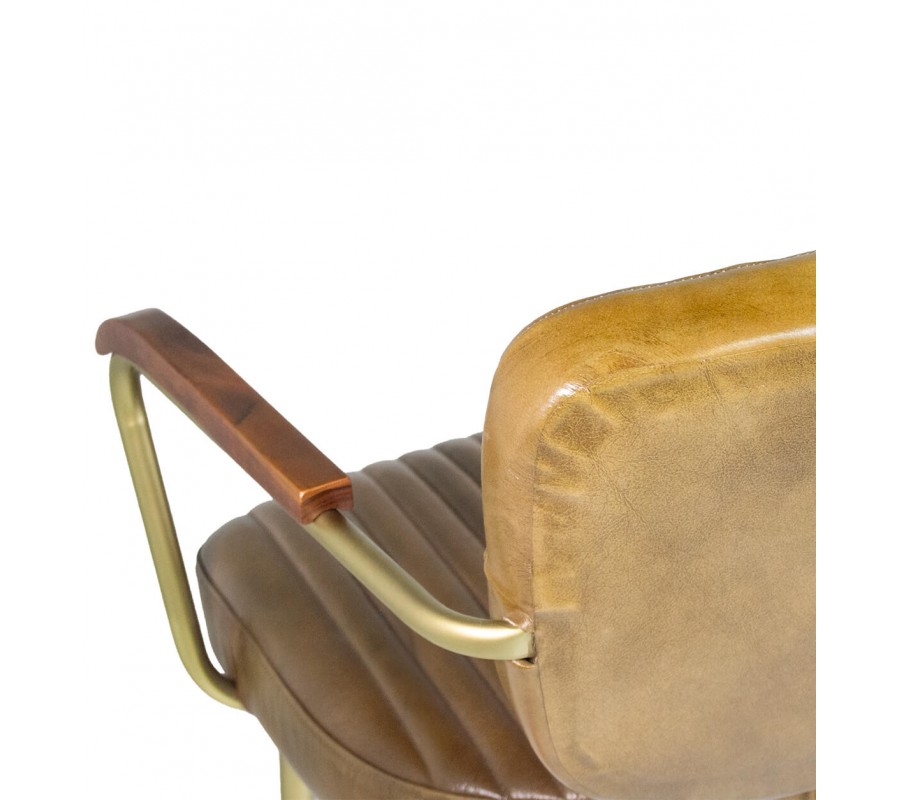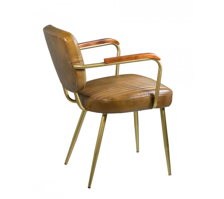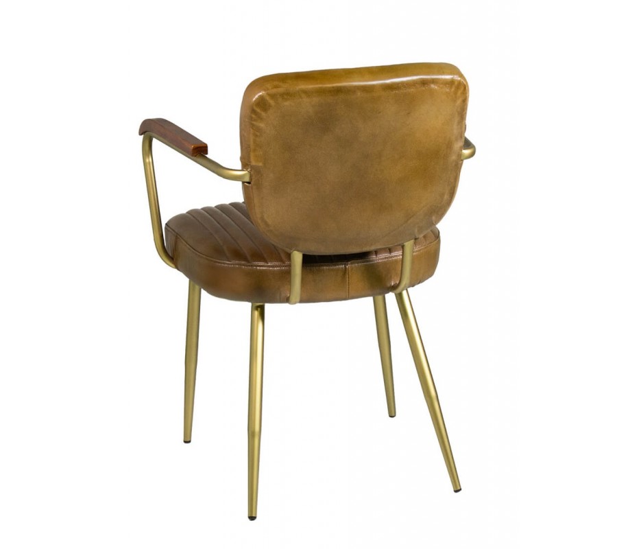 Vnútro tvorí bohato čalúnená pamäťová pena, ktorá zabezpečuje vysoký komfort pri dlhšom sedení. Kovové opierky na ruky v zlatej farbe sú doplnené drevenými časťami, ktoré ponúkajú príjemne rozšírenú plochu na položenie rúk. Štíhle kovové nožičky v rovnakej zlatej povrchovej úprave dodávajú stoličke vizuálnu ľahkosť a harmonicky dopĺňajú celkový dizajn. Zadný pár je jemne vyosený smerom von, čo zvyšuje stabilitu a podčiarkuje jej retro charakter.
