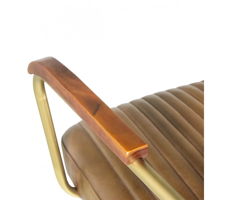 Sedacia časť a chrbtová opierka majú štvorcový tvar so zaoblenými hranami a sú navzájom prepojené dvojicou tenkých ohnutých kovových tyčí, ktoré zabezpečujú stabilitu a pevnú oporu. Celý povrch je potiahnutý prírodnou kožou v hnedom odtieni s jemným patinovaným efektom, ktorý dodáva stoličke dojem autentickosti a jedinečného vzhľadu. Dekoratívne vertikálne prešívanie po celej ploche opierky aj sedadla vytvára optické predĺženie tvaru a pripomína klasické čalúnenie typické pre retro štýl.