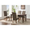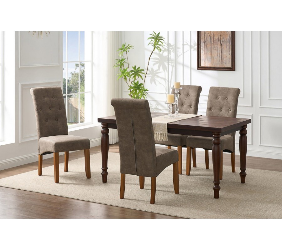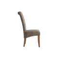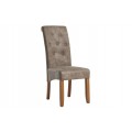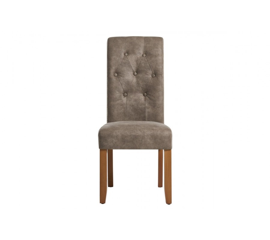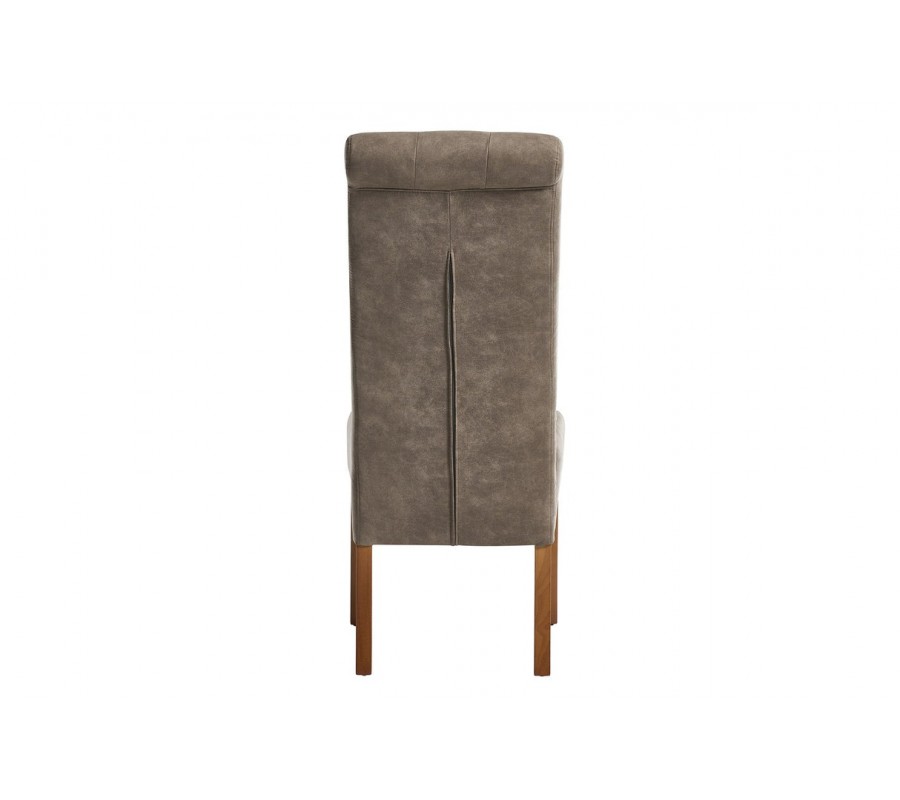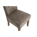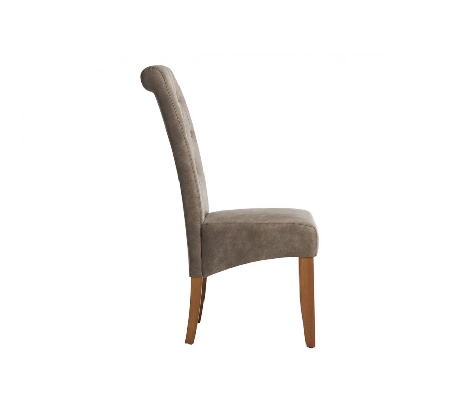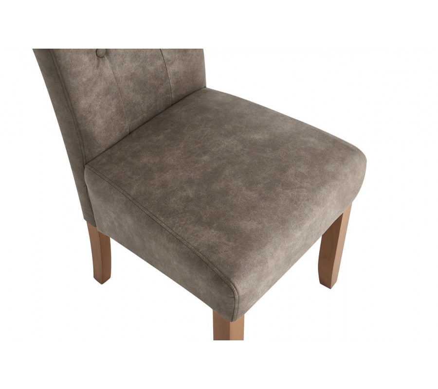 Stolička má konštrukciu vyrobenú z pevného masívneho dreva. Na nožičkách je odhalená a lakovaná v svetlom hnedom teplom odtieni. Sedadlo aj chrbtová opierka sú pokryté mäkkou penovou výplňou a poťahom z mikrovlákna s príjemným semišovým finišom. Tento materiál je ľahko udržiavateľný, výborne odolná vplyvom každodenného používania a je príjemný na dotyk. Farebné prevedenie v štýlovom odtieni taupe kombinuje sivé a hnedé tóny. V kombinácii s drevom pôsobí teplým dojmom.