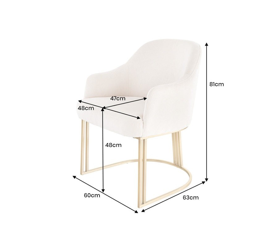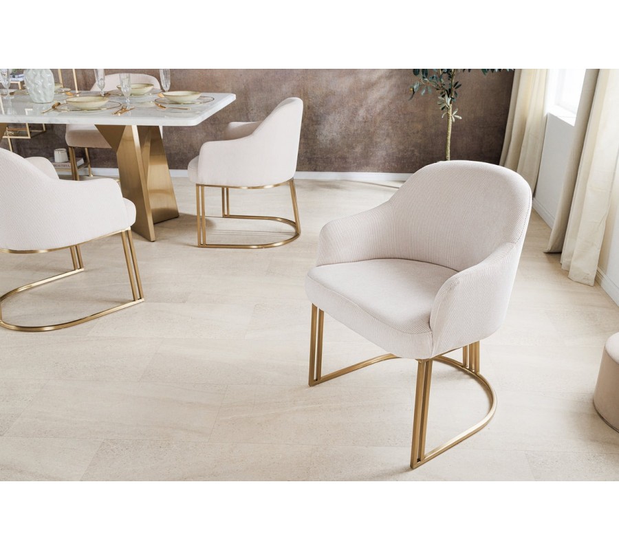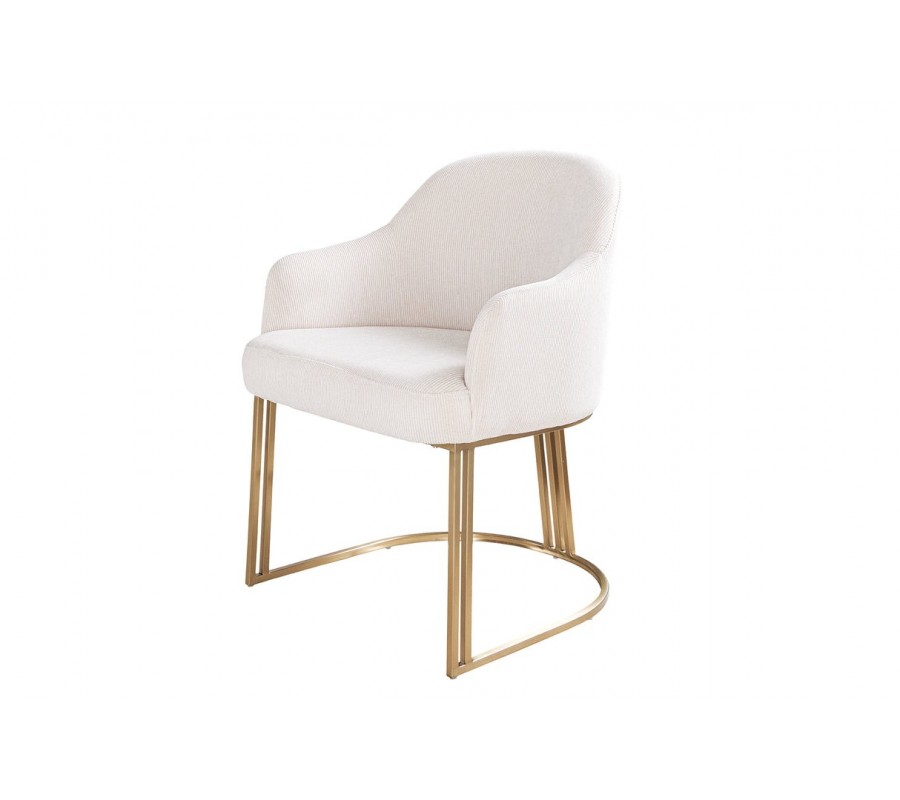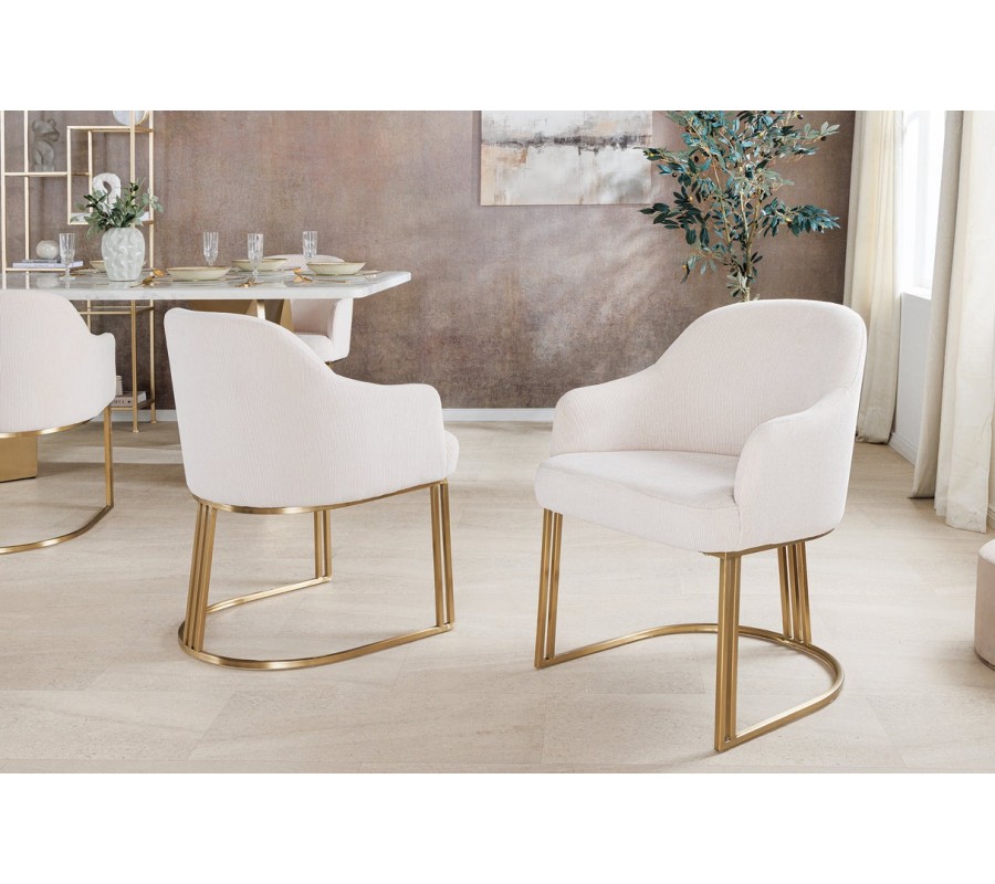 Dizajnová art deco jedálenská stolička Hejdy s opierkami na ruky s menčestrovým béžovým poťahom a zlatou podstavou 81 cm