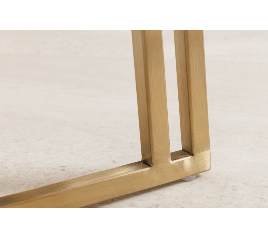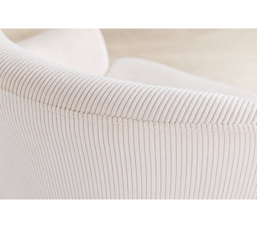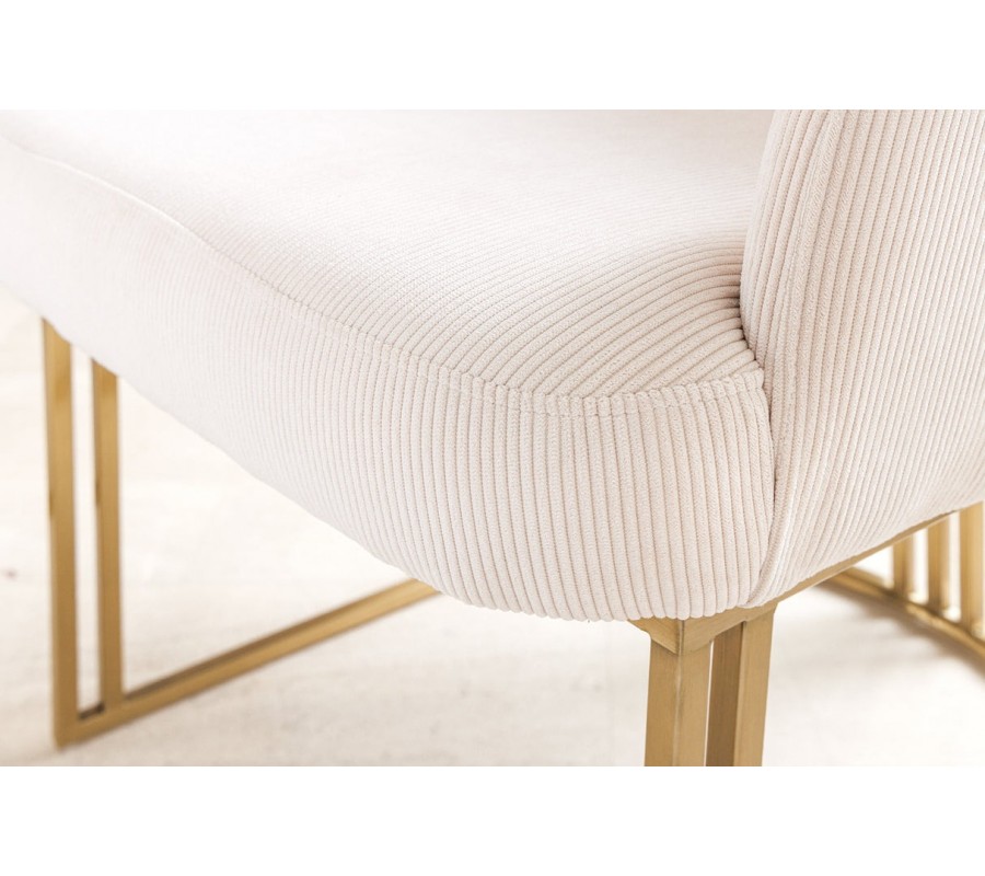 Vrchná časť má pevný drevený rám, pokrytý penovou výplňou a textilným poťahom z mikrovlákna. Tento materiál je mimoriadne odolný voči vplyvom každodenného používania a tiež nenáročný na údržbu. Má výraznú menčestrovú štruktúru s lineárnym vzorom a jeho krémová béžová farba pôsobí teplým a útulným dojmom. Podstava je vyrobená z kovu s lesklou zlatou povrchovou úpravou, ktorá prináša do dizajnu luxusný glamour nádch.