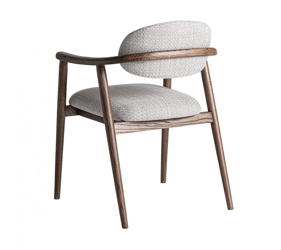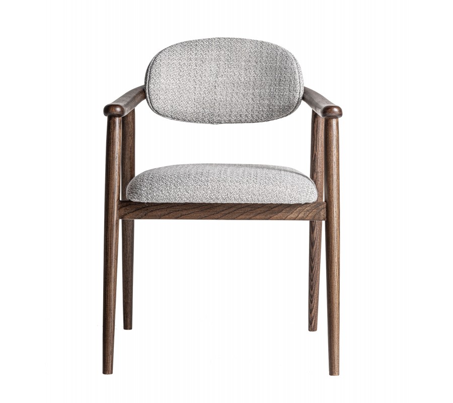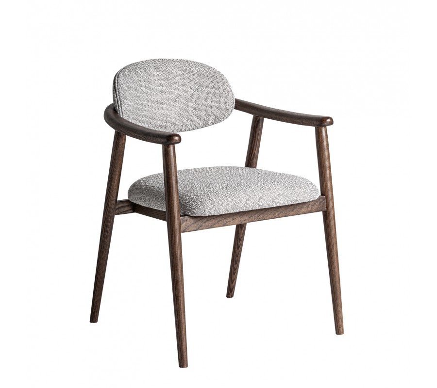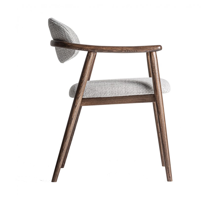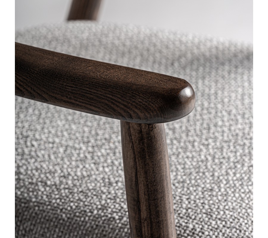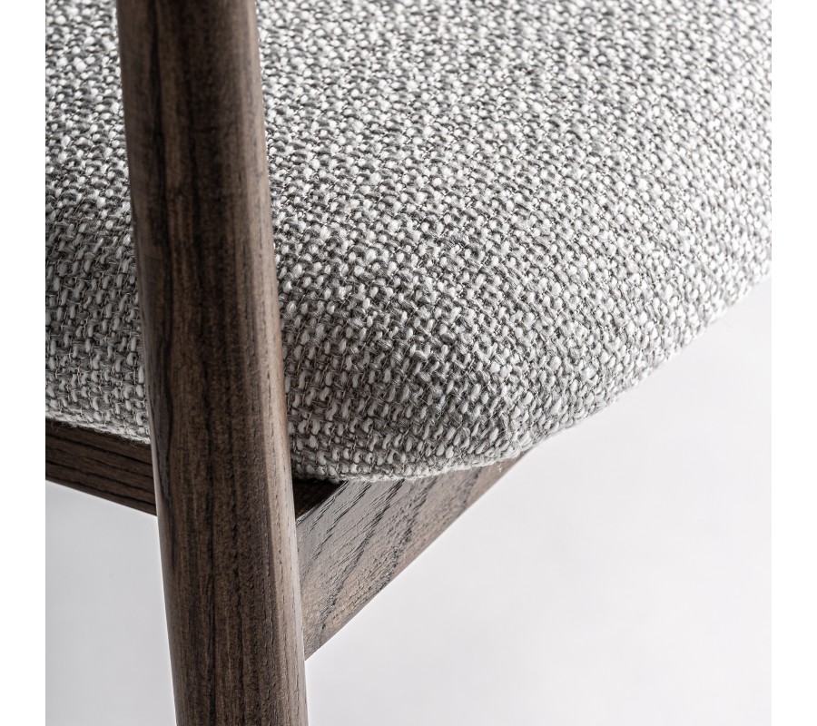 Stolička má pevný rám z masívneho dreva. Povrchová úprava je matná, čo pôsobí mäkko a prevedenie v tmavohnedej farbe zachováva prirodzenú kresbu dreva. Rám má tak harmonický prírodný vizuál a pôsobí teplým dojmom. Výborne ho dopĺňa poťah v melírovanej sivej farbe. Výrazné tkanie a kombinácia tenších a hrubších vlákien v spojení s tmavšími a svetlejšími odtieňmi vytvára vizuálne aj dotykovo atraktívnu štruktúru.