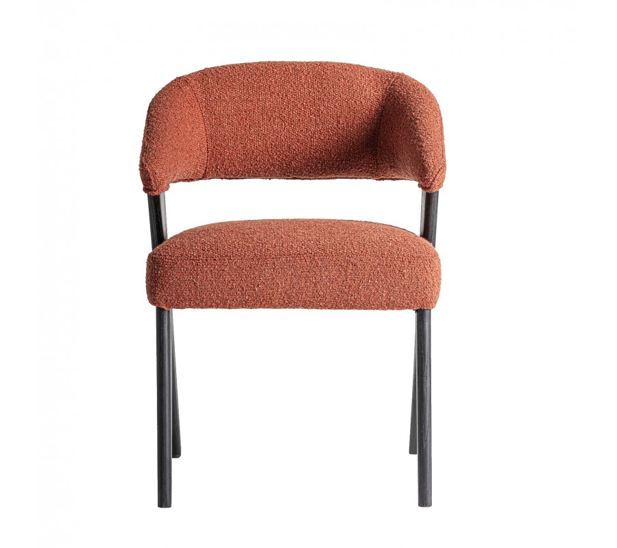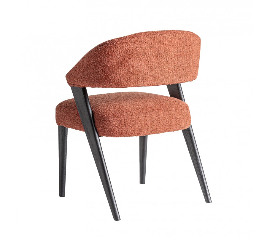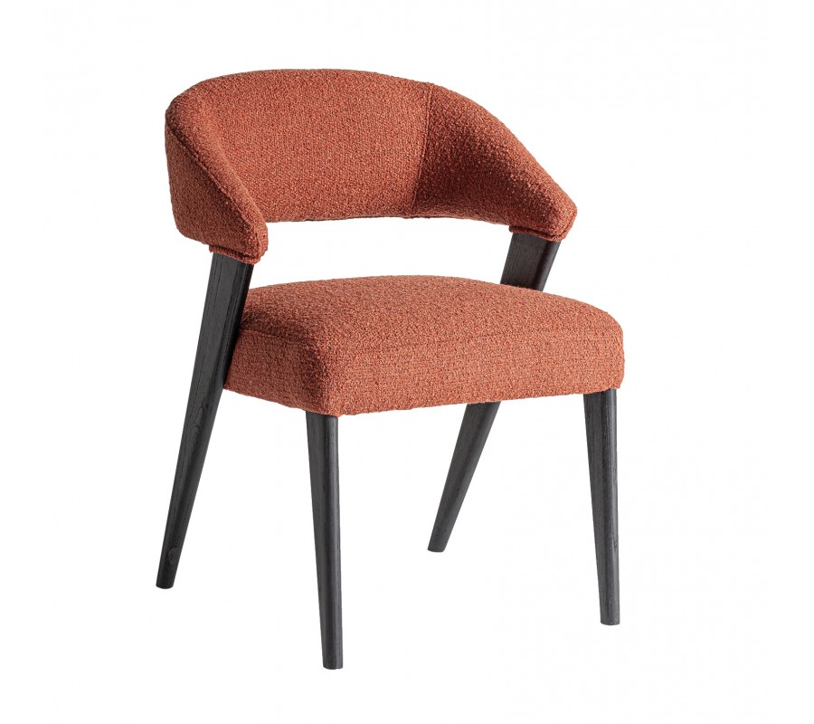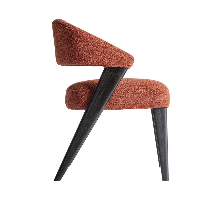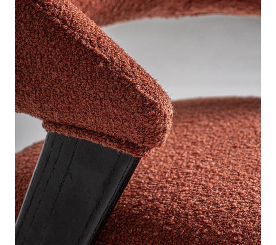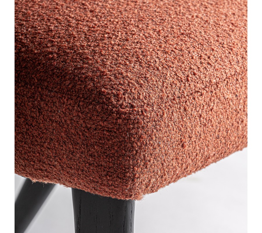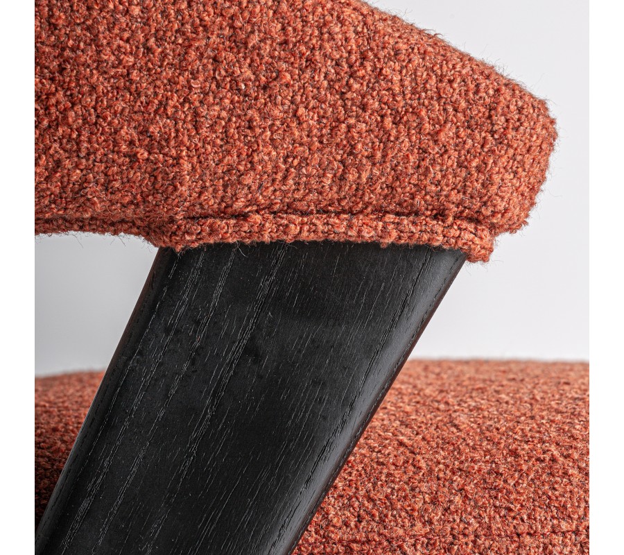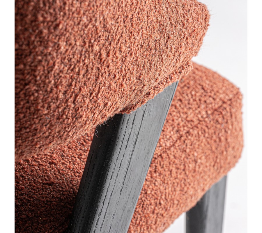Konštrukcia je vyrobená z kombinácie dubového a kaučukového dreva, ktoré zaručuje jej pevnosť a výbornú stabilitu. Povrchová úprava v matnom čiernom prevedení zdôrazňuje naturálnu kresbu letokruhov a prináša tak do dizajnu subtílny prírodný element. Sedadlo aj opierka sú čalúnené, s poťahom z buklé v terakotovej červenej farbe. Hrubá štruktúra textílie je mäkká a príjemná na dotyk, zatiaľ čo mikrovlákno zaisťuje výbornú odolnosť voči vplyvom každodenného používania.