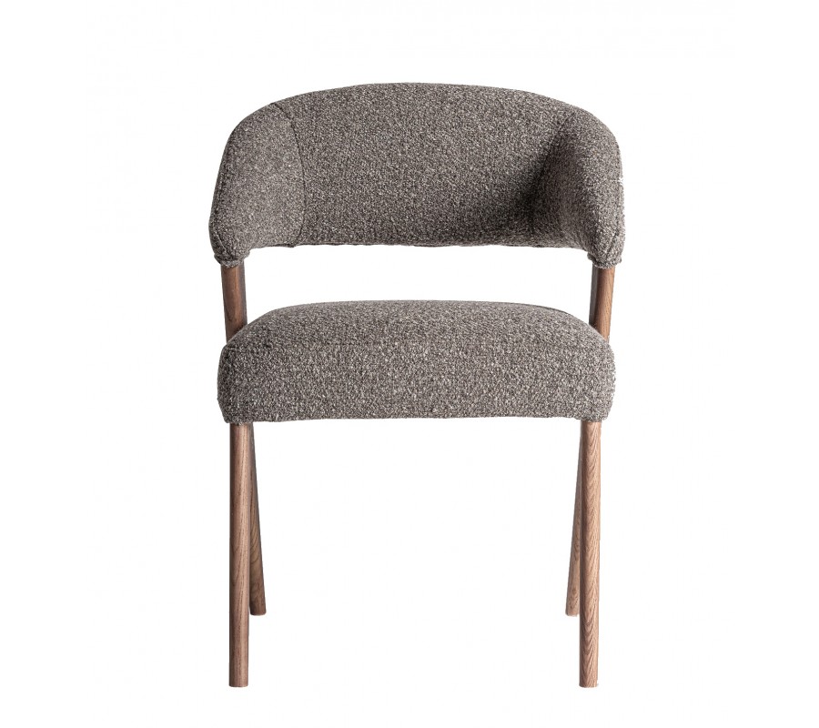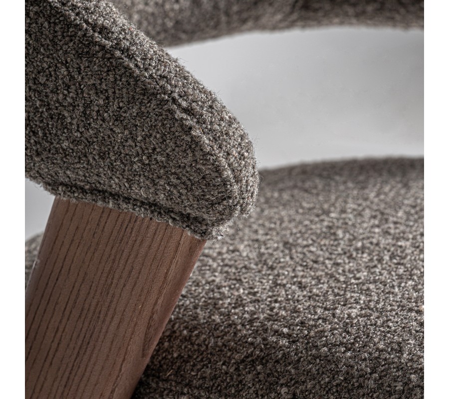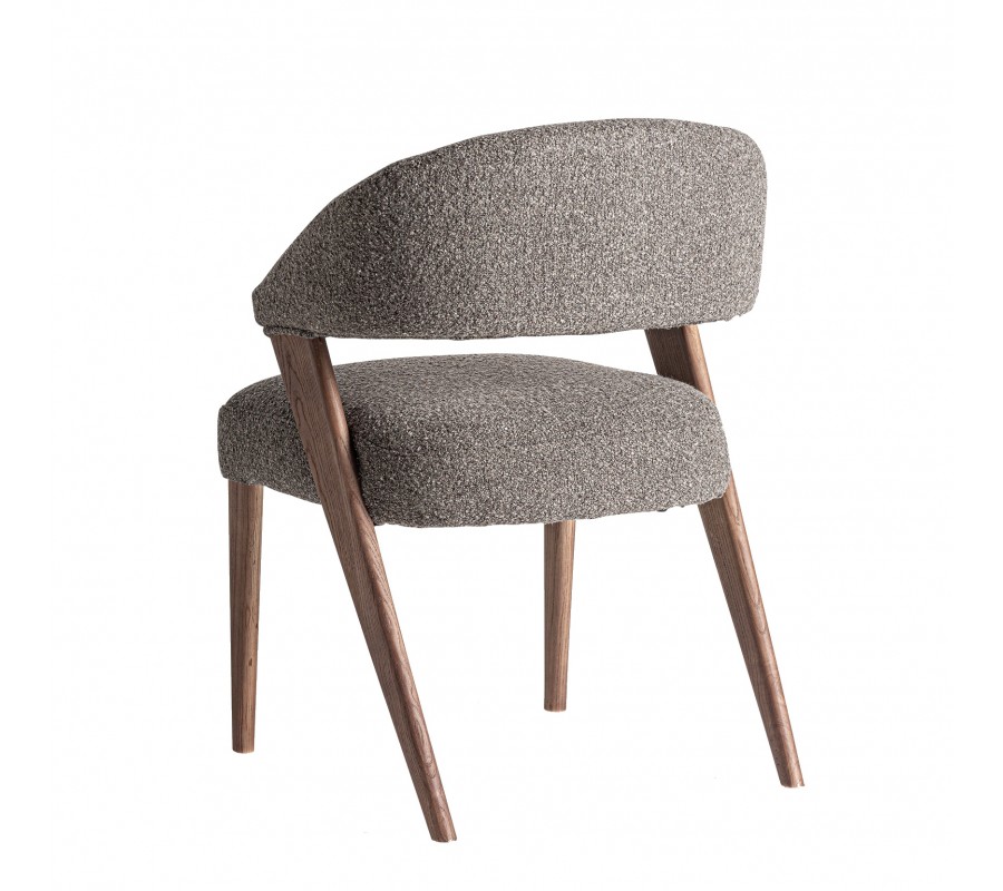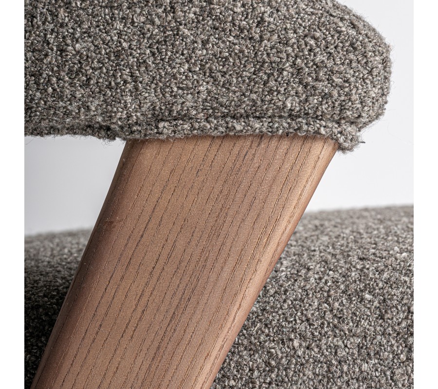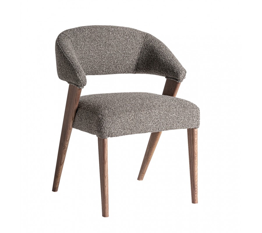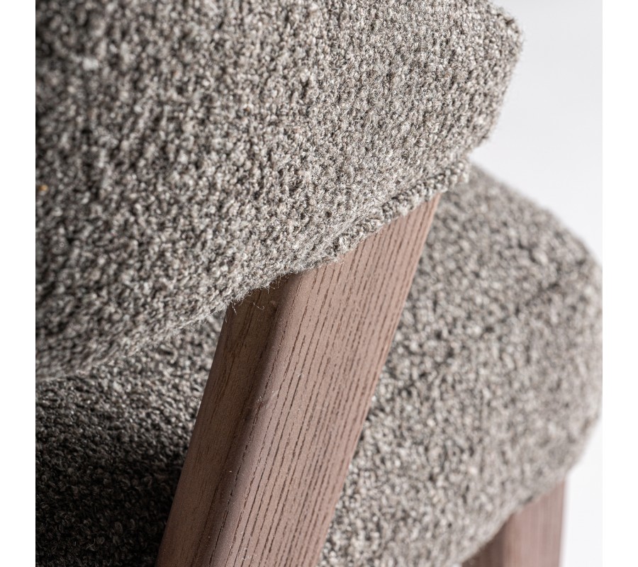 Stolička pevný rám, vyrobený z kombinácie dubového a kaučukového dreva. Lakovanie v naturálnej svetlej hnedej farbe s viditeľnou štruktúrou letokruhov dodáva nábytku prírodný element a pôsobí harmonickým teplým dojmom. Sedadlo a opierka sú čalúnené a prekryté poťahom z mikrovlákna v buklé prevedení. Tento materiál je mimoriadne odolný a výrazná buklé štruktúra mu dodáva mäkkosť. Je tiež vizuálne atraktívna a výborne korešponduje s melírovanou svetlou sivou farbou.