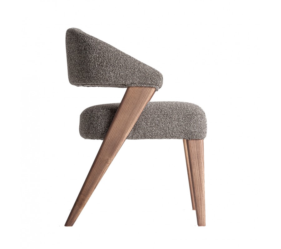 Stolička má modernú dynamickú siluetu, v ktorej dominuje šikmá línia zadných nožičiek, prechádzajúca zo spodnej časti až po prednú stranu opierok na ruky. Bočné opierky prechádzajú plynule v elegantnej krivke do chrbtovej opierky, ktorá nie je spojená so sedadlom a dizajn tak pôsobí vzdušným dojmom. Sedadlo v zadnej časti kopíruje polkruhový tvar opierky a na prednej strane je položené na rovných nožičkách. Výrazné geometrické línie zjemňuje penové čalúnenie a nožičky s plochým profilom majú tiež zaoblené hrany.