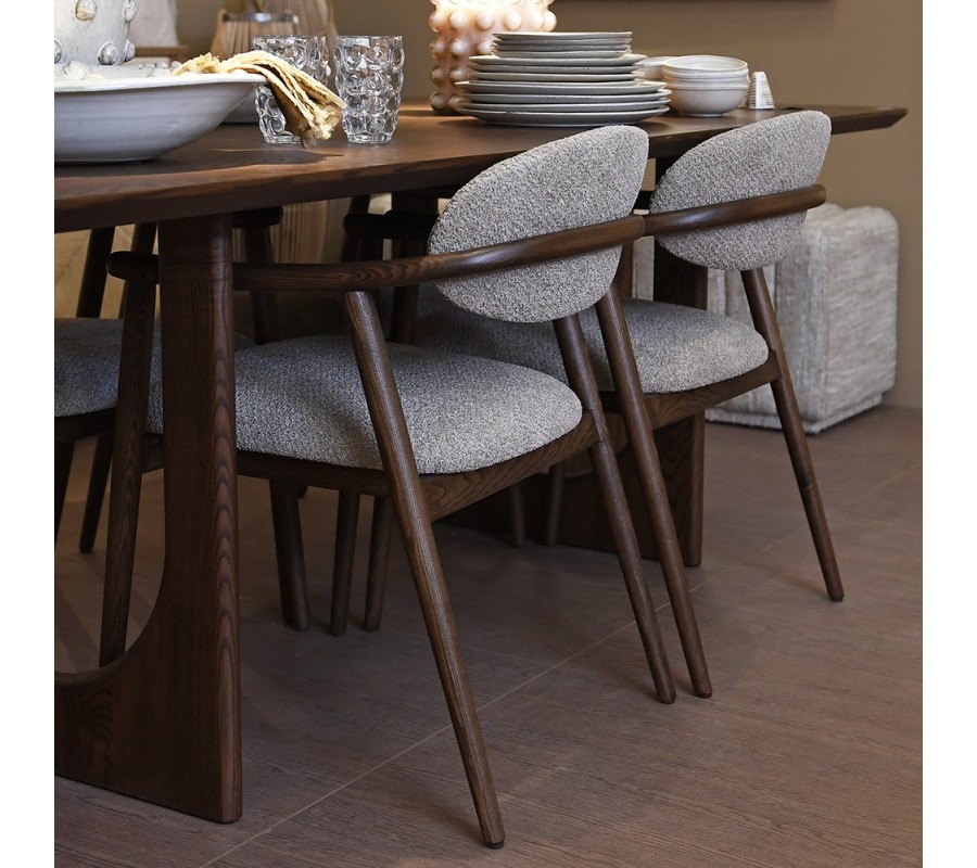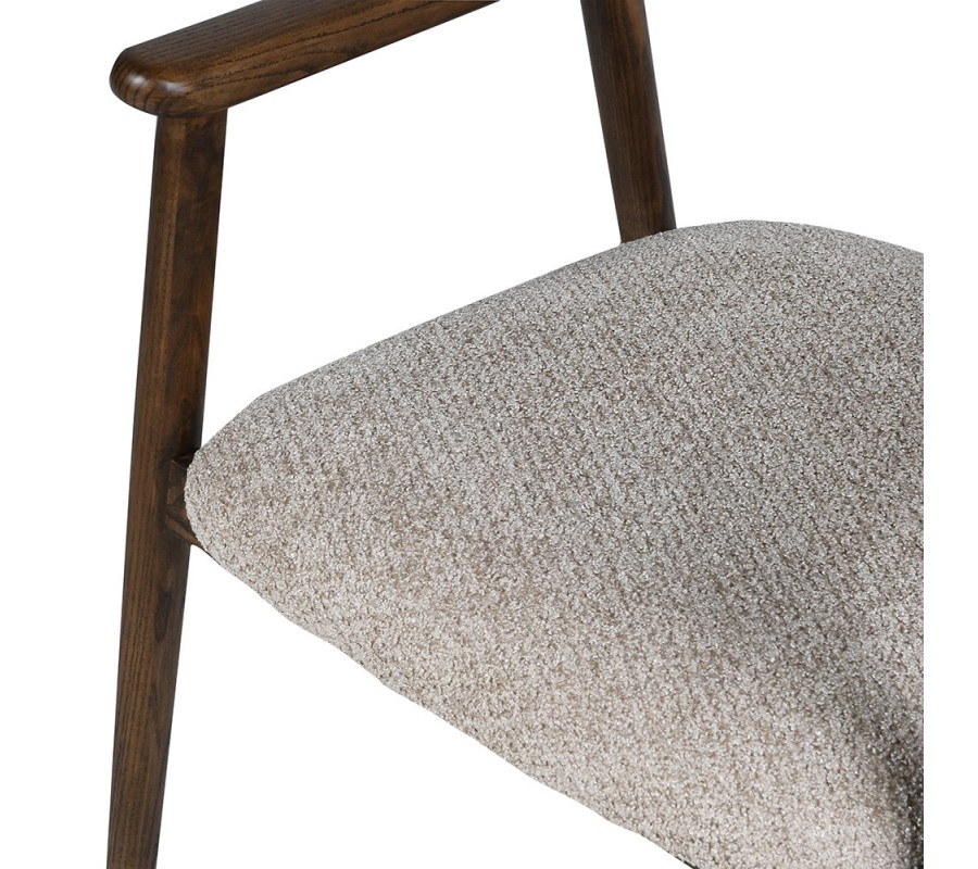 Operadlo s jemným oblúkovým tvarom a subtílnym prehnutím zaisťuje pohodlnú oporu počas sedenia. Sedadlo aj operadlo sú potiahnuté mäkkou látkou v tlmenom sivom odtieni, ktorý harmonicky ladí s prírodným tónom dreva a zároveň sa ľahko kombinuje s rôznymi farebnými prvkami v interiéri.
