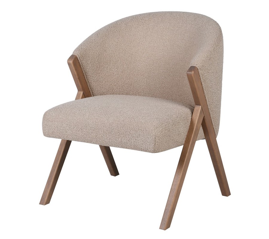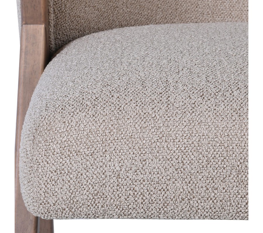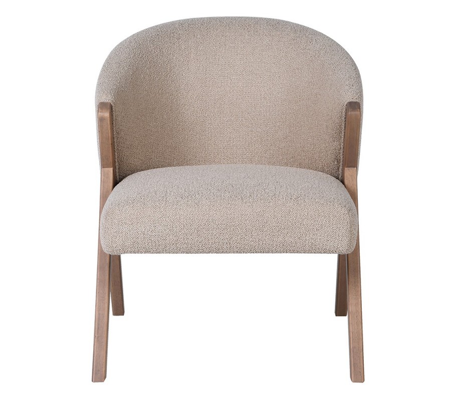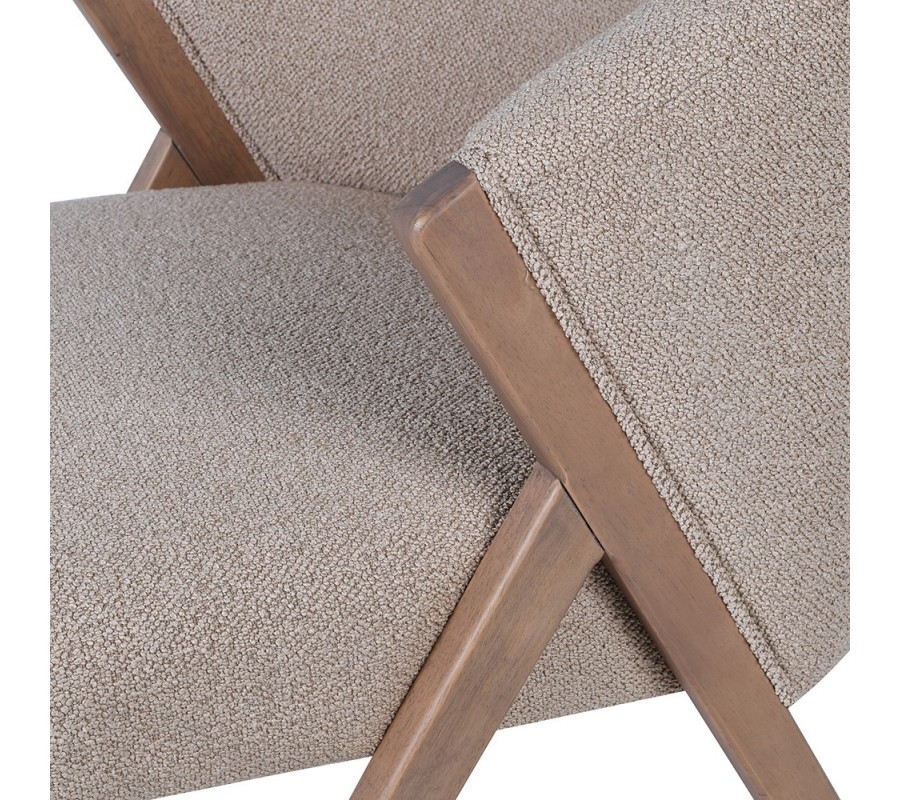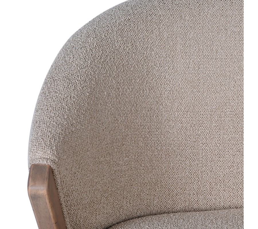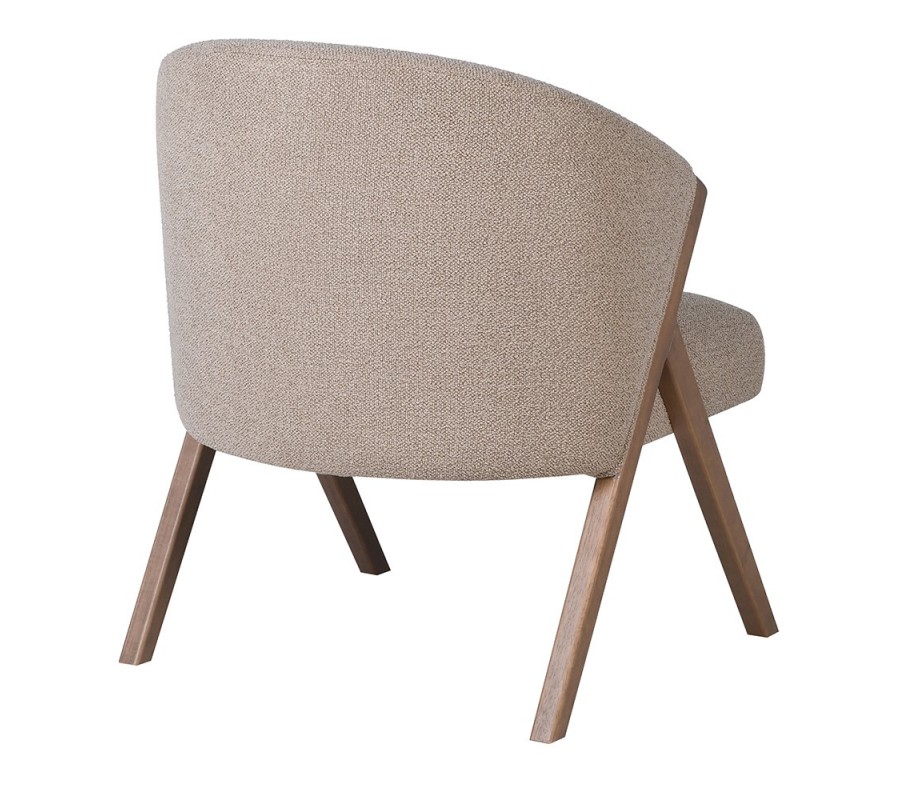 Výrazným detailom stoličky je stabilná kaučuková konštrukcia s vyosenými prednými aj zadnými nožičkami. Zadné nožičky elegantne prechádzajú do bočných opierok a spolu s prednými nožičkami vytvárajú dizajnový trojuholníkový tvar, ktorý dodáva modelu moderný charakter. Poťah v taupé béžovej farbe s jemnou štruktúrou pôsobí prirodzene a ľahko zapadne do rôznych štýlov interiéru.