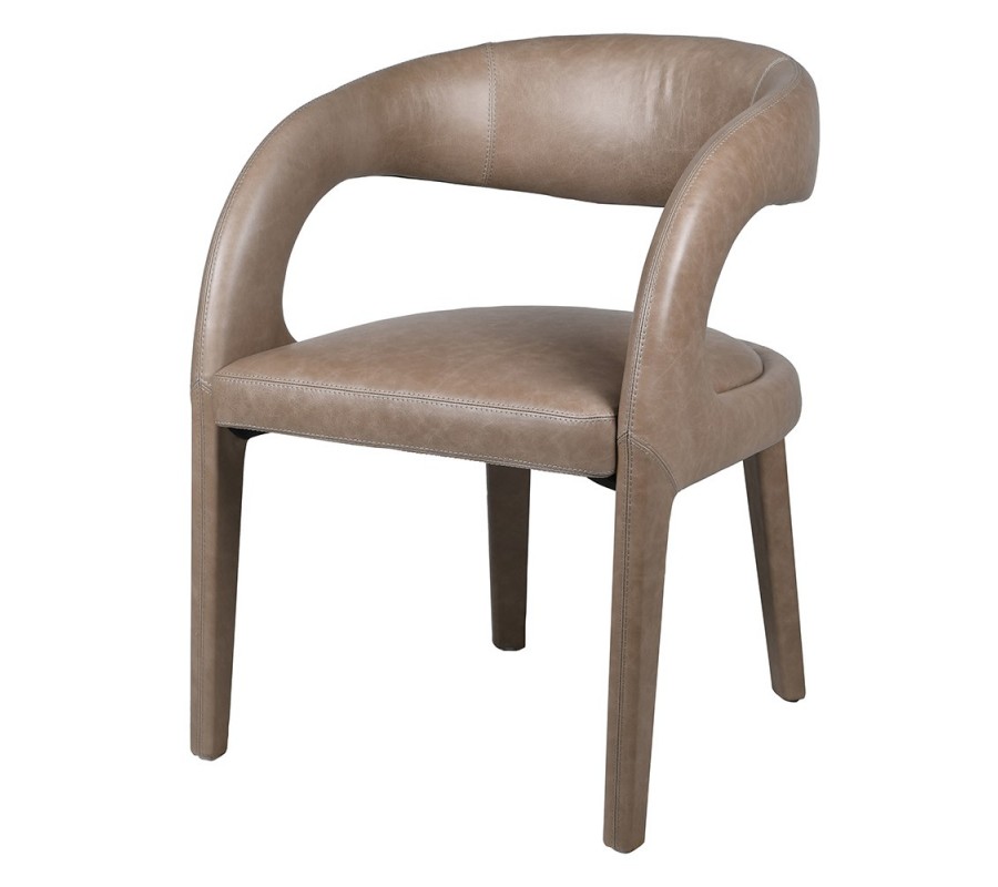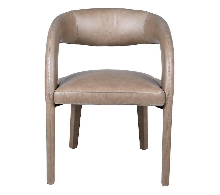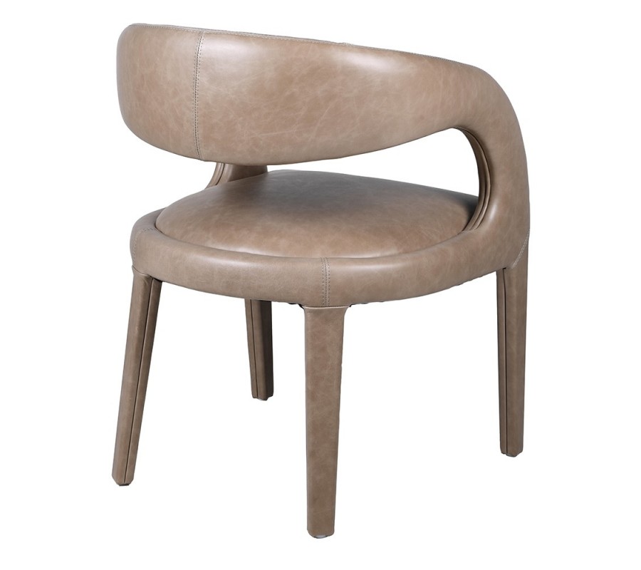 Moderná atypická jedálenská stolička Leslie s béžovým koženým poťahom a oble tvarovanými nožičkami prináša do interiéru luxus a nadčasovú eleganciu. Jej dizajn zaujme oblými hranami a atypickou konštrukciou – bočné opierky sú súčasťou predných nožičiek a elegantne sa spájajú do chrbtovej opierky, pričom medzi opierkou a sedadlom zostáva otvor, ktorý pôsobí vzdušne a moderne.