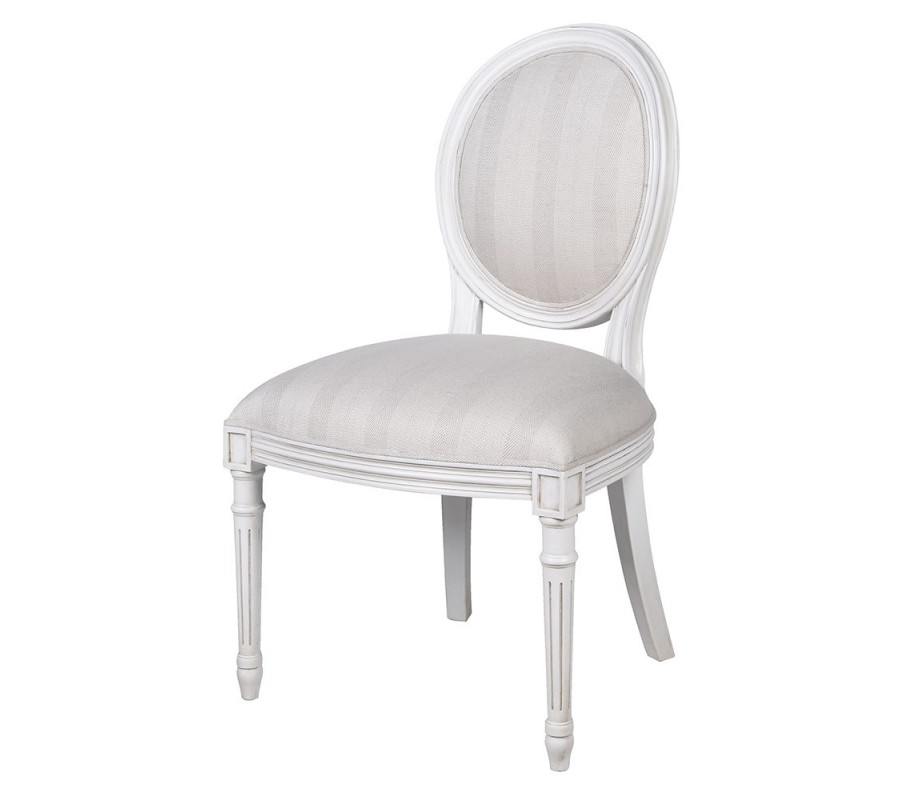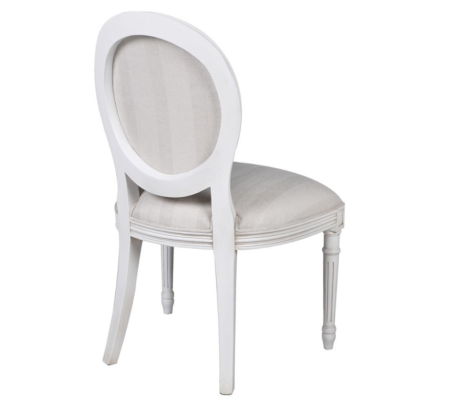Stolička má pevný rám, vyrobený z mahagónového dreva. Mohutné sedadlo a oválnu chrbtovú opierku pokrýva penová výplň a textilný poťah. Drevo je lakované v bielej farbe a látka má výrazné tkanie so vzorom rybej kosti a dizajnom širokých pruhov v svetlosivých odtieňoch. Táto paleta pôsobí elegantne a zároveň umožňuje široké možnosti kombinovania s ďalším nábytkom.