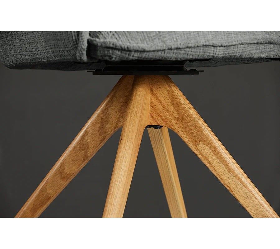Stolička má pevný rám z dubového dreva, ktorého naturálna svetlá hnedá farba s prirodzenou kresbou letokruhov zdobí podstavu. Vrchná časť je pokrytá penovým čalúnením s horizontálnym prešívaným detailom na chrbtovej opierke. Dizajnu dominuje poťah v sivej farbe zo ženilkovej textílie s typickým plyšovým finišom. Je príjemný na dotyk a zároveň mimoriadne odolný voči vplyvom každodenného používania, čo je pri sedacom nábytku dôležité pre zachovanie jeho vzhľadu.