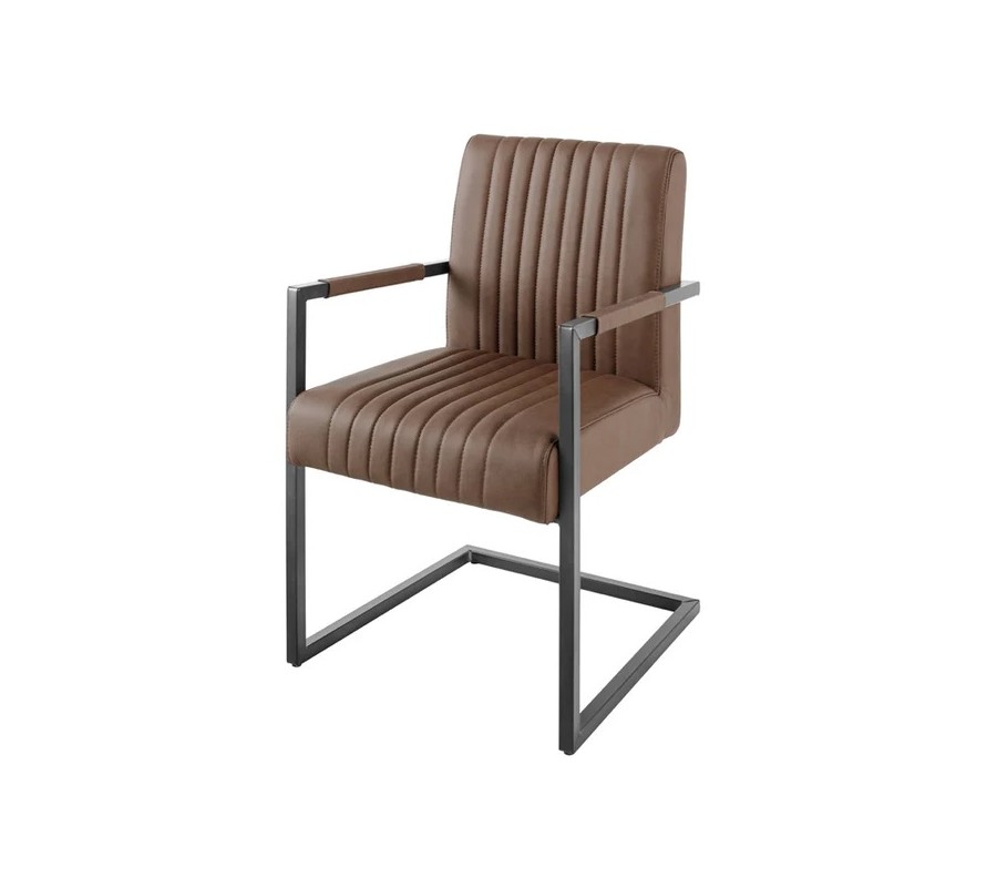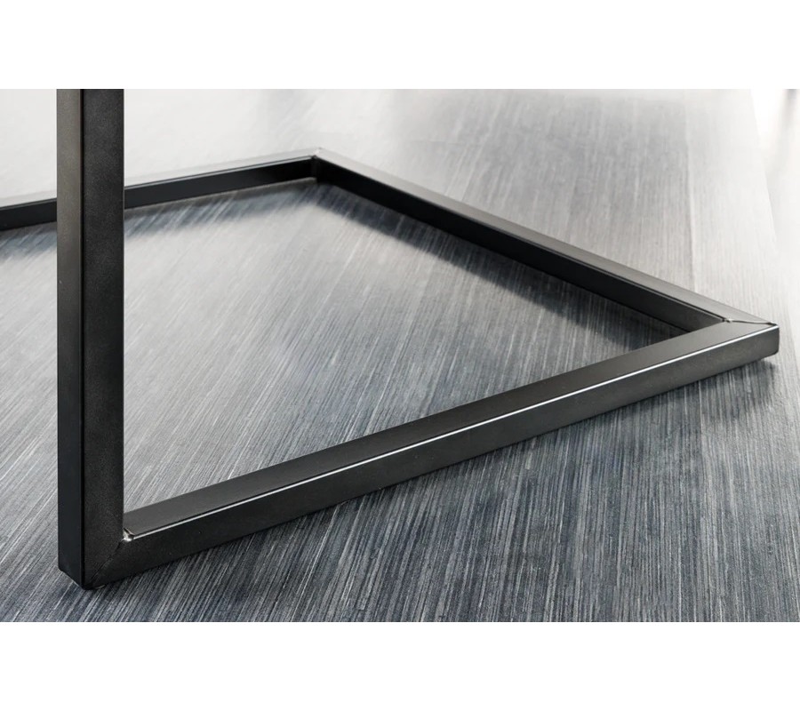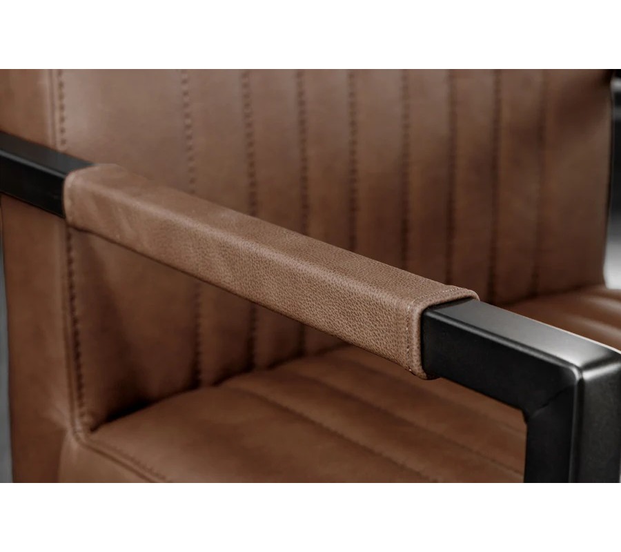 Čierna matná kovová konštrukcia má konzolový tvar obráteného písmena U, vďaka čomu pôsobí subtílne, no zároveň stabilne a mierne pruží pri záťaži. Kovový rám prirodzene pokračuje od podlahy po bokoch sedadla, ďalej prechádza do integrovaných opierok na ruky, ktoré sú v strede doplnené koženým pásom s rovnakým poťahom ako sedadlo. Tento detail nie je čalúnený, ide o vizuálny a funkčný doplnok, ktorý dotvára súdržný vzhľad. Rám vystupuje aj za operadlo, kde sa spája do jednoliateho celku.
