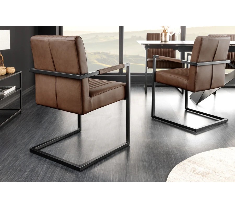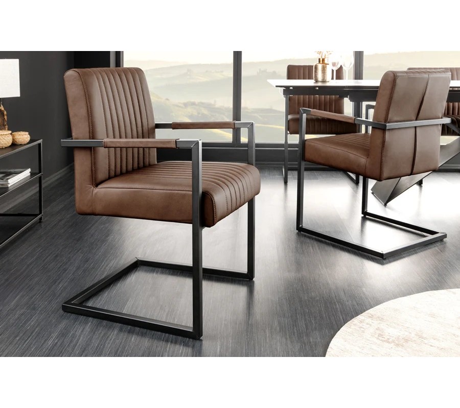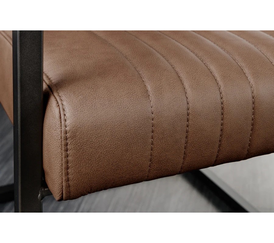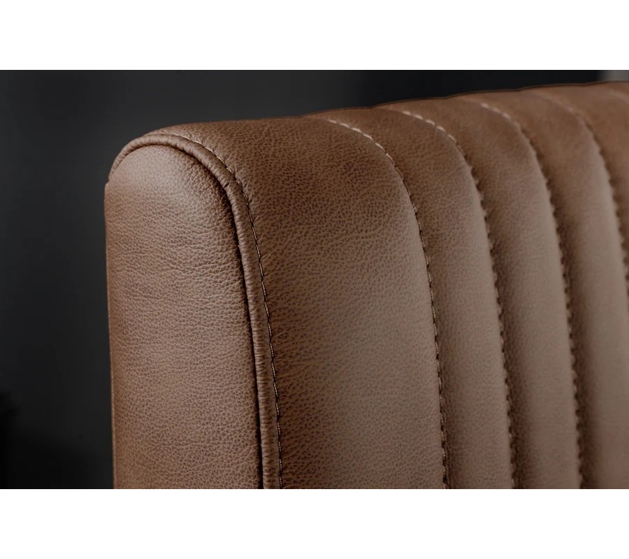 Konzolová stolička Inspirativo je výrazným dizajnovým kúskom, ktorý spája industriálny štýl s retro prvkami. Svojím vzhľadom pripomína klasické automobilové sedadlá, najmä vďaka bohatému vertikálnemu prešívaniu na sedacej časti aj operadle. Poťah z umelej kože v teplom hnedom odtieni vintage brown má jemný lesk a decentnú štruktúru, ktorá dodáva stoličke elegantný a autentický výraz. O komfort sa stará vnútorné pružinové jadro, ktoré zaisťuje mäkkosť a pružnosť sedenia.