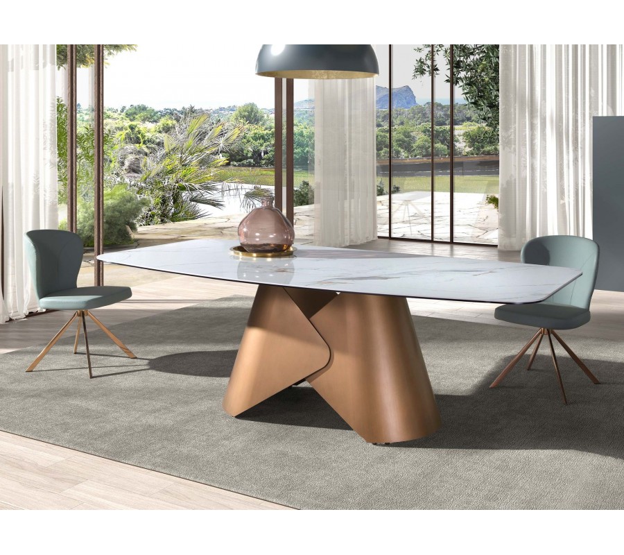 Podstava je vyrobená z nehrdzavejúcej ocele v ružovozlatom odtieni rosegold, ktorý v kombinácii so zelenou farbou vytvára elegantný art deco vizuál. Na jej vrchole sa nachádza mechanizmus, ktorý umožňuje otočenie sedacej časti o 360º. Štyri nožičky sú zošikmené, čo zaručuje výbornú stabilitu. Ich plochý profil s rozšírenou siluetou pôsobí v kombinácii s lesklým povrchom dynamickým dojmom.