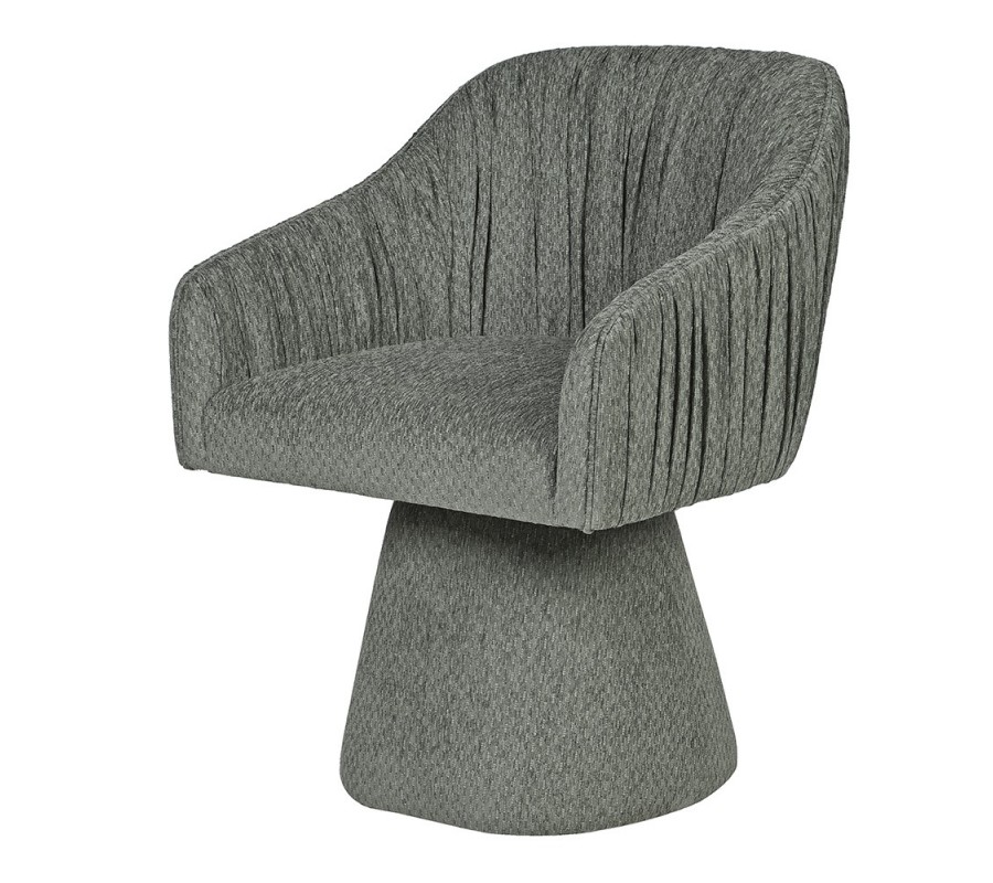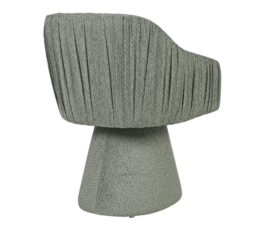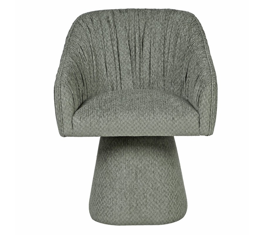 Moderné čalúnené kreslo Opera je luxusný dizajnový solitér, ktorý zaujme na prvý pohľad svojou originálnou siluetou a detailne prepracovaným spracovaním. Stojí na stabilnej podstave v tvare zrezaného kužeľa, ktorá mu dodáva pevnosť a moderný charakter. Bočné opierky plynulo nadväzujú na opierku chrbta, čím vytvárajú obklopujúci tvar, ktorý poskytuje maximálne pohodlie pri sedení. Výrazným dekoračným prvkom je jemné riasenie po vnútorných aj vonkajších stranách opierok, ktoré kreslu dodáva eleganciu a plastickosť. Povrch tvorí kvalitný textilný poťah v tlmenej zelenej farbe, ktorá pôsobí sofistikovane a ľahko sa kombinuje s inými odtieňmi interiéru.