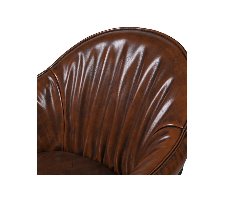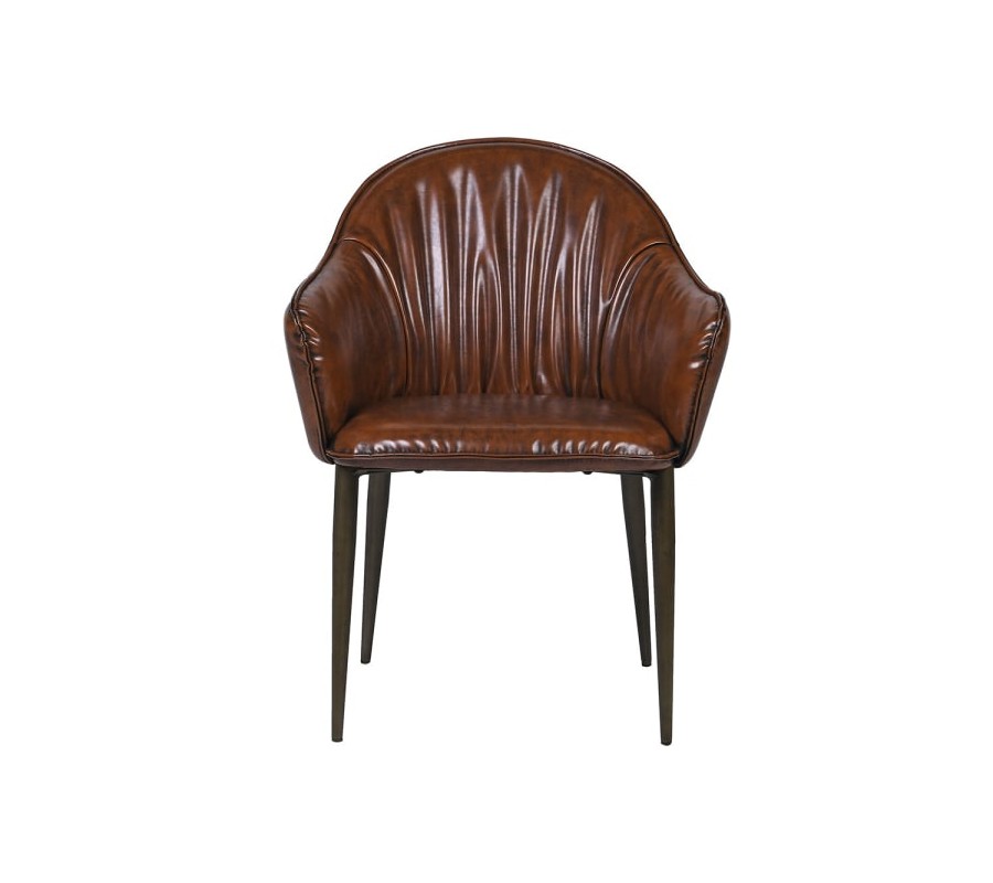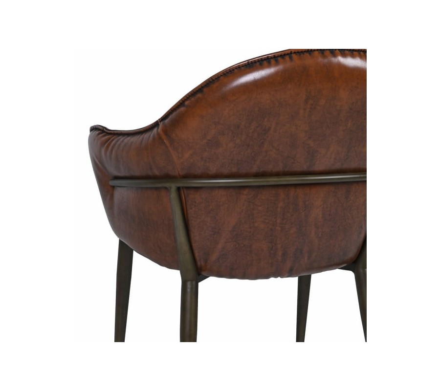 Jedálenská stolička Bard prináša do interiéru charakter a eleganciu s nádychom industriálneho štýlu. Jej eko kožený poťah v hnedom odtieni s jemným leskom pôsobí luxusne a zároveň autenticky. Riasené prešívanie na chrbtovej opierke dodáva stoličke plastickosť a mäkkosť, pričom zaoblené operadlo s integrovanými bočnými opierkami obopína postavu a zaručuje pohodlné sedenie.