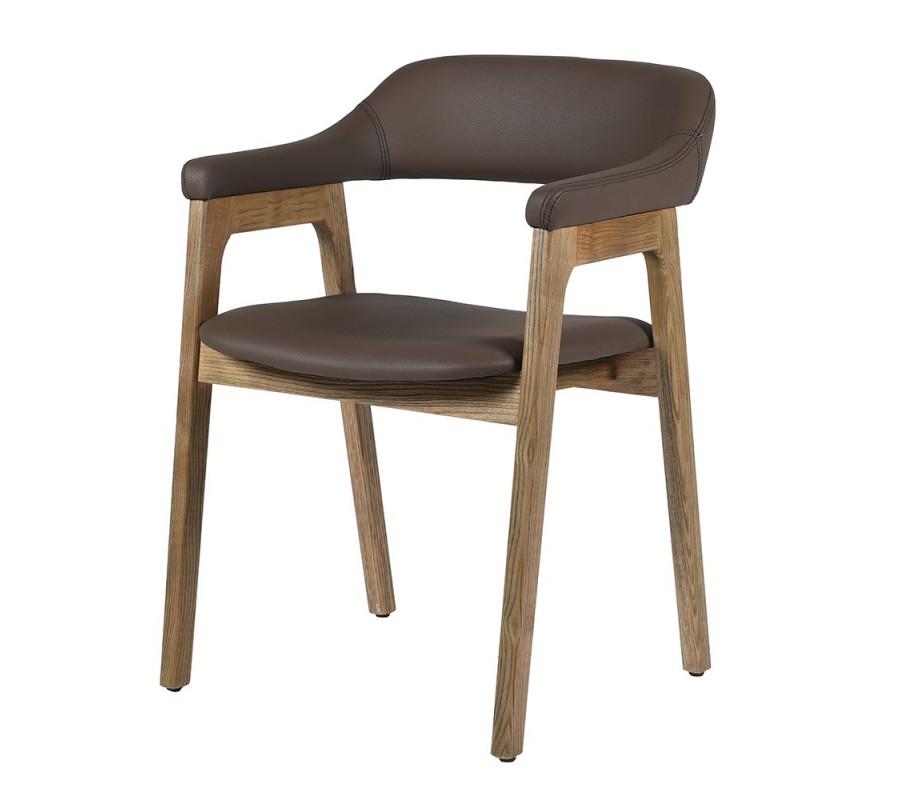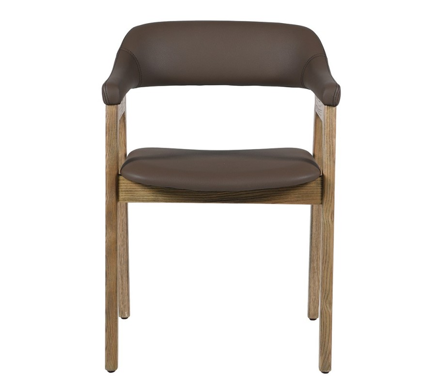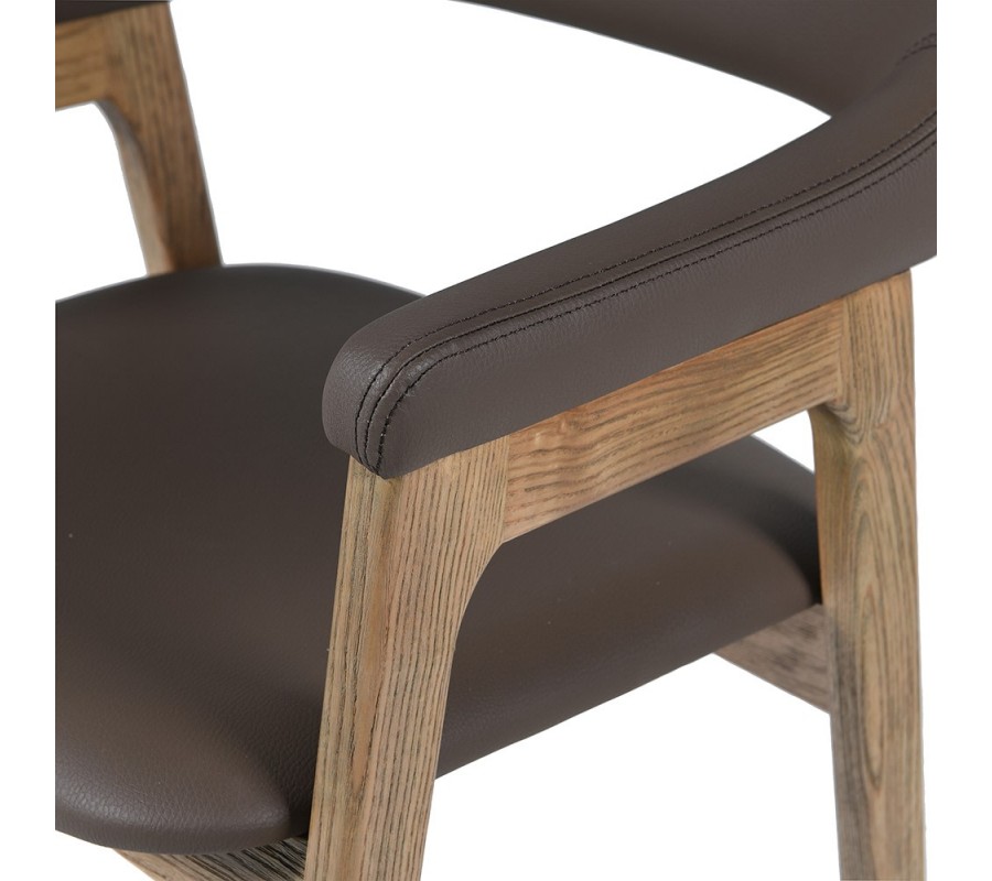 Jedálenská stolička Vettis zaujme svojím elegantným retro dizajnom a prepracovanými detailmi. Kombinuje hnedý eko kožený poťah s jemným prešívaním a hnedú topoľovú konštrukciu s výraznou štruktúrou letokruhov, ktoré zvýrazňujú prirodzený charakter dreva.