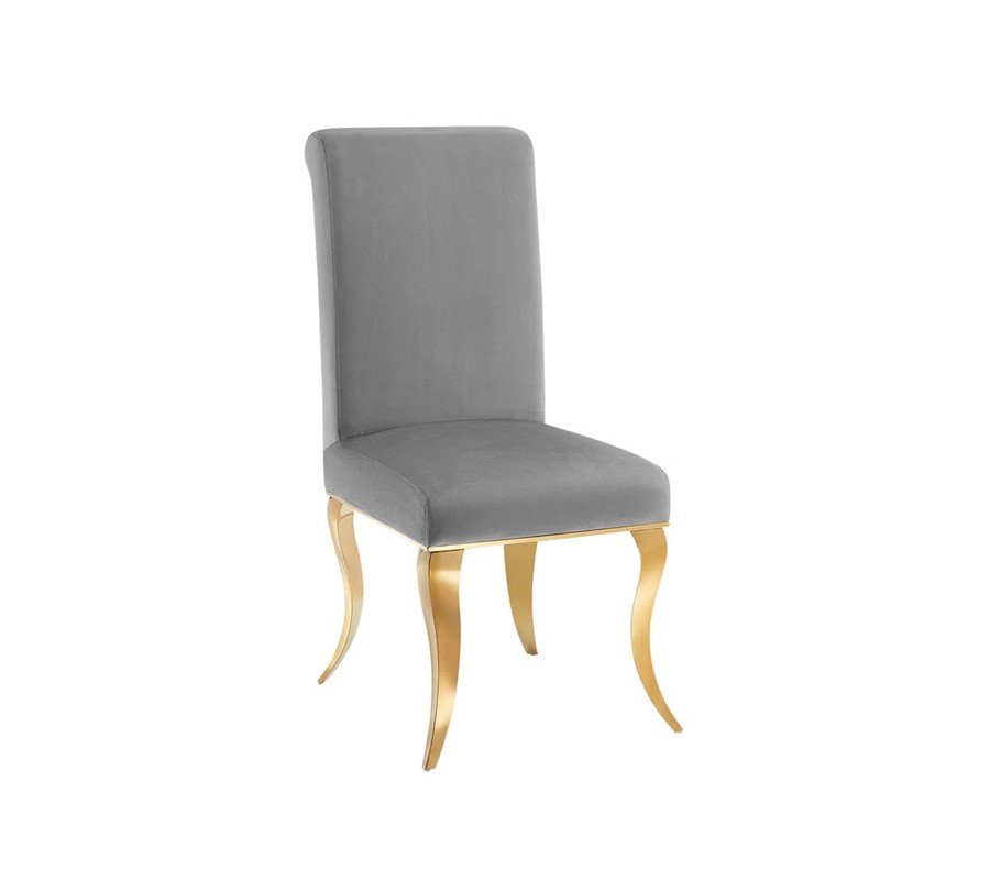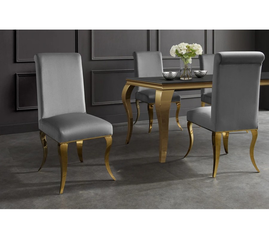 Dizajnová moderná jedálenská stolička Gold Barock so zamatovým poťahom v sivej farbe a so zlatými kabriolovými nožičkami 105 cm
