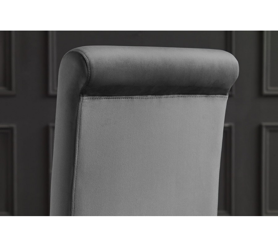 Povrch stoličky tvorí kvalitný zamatový poťah z pevného mikrovlákna, ktorý je mäkký na dotyk a dodáva nábytku exkluzívny charakter. Vnútorné čalúnenie je dostatočne komfortné, čo zaručuje pohodlné sedenie aj počas dlhších stolovaní. Prevedenie bez opierok na ruky zvýrazňuje čisté línie dizajnu a umožňuje praktické využitie priestoru pri jedálenskom stole.