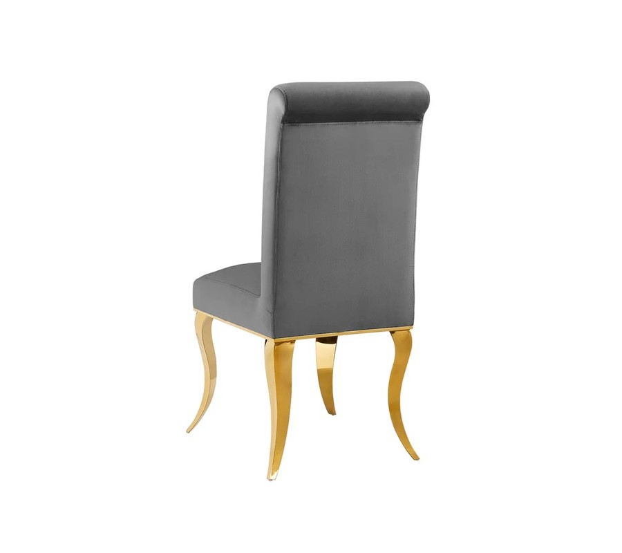 Výrazným vizuálnym prvkom sú kovové nohy z nehrdzavejúcej ocele v zlatej farbe, tvarované do dekoratívnych kabriolových kriviek. Tento barokový detail dodáva stoličke noblesný vzhľad, zatiaľ čo pevná oceľová konštrukcia zabezpečuje stabilitu, pevnosť a dlhodobú odolnosť. Zlatý povrch elegantne odráža svetlo a zvýrazňuje glamour charakter modelu.
