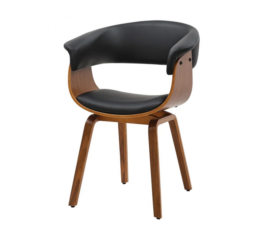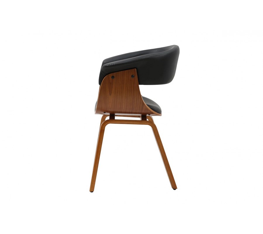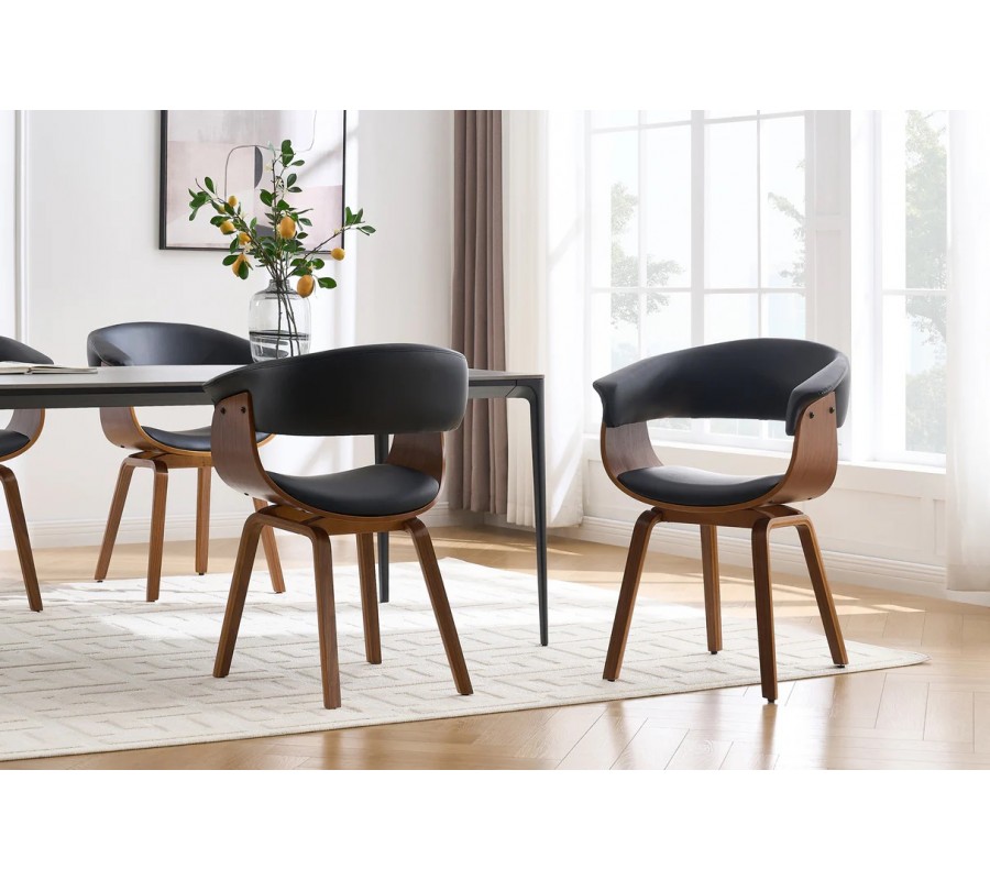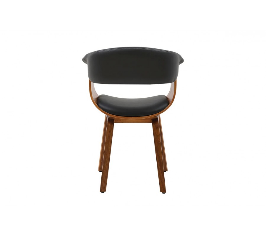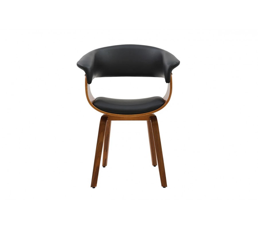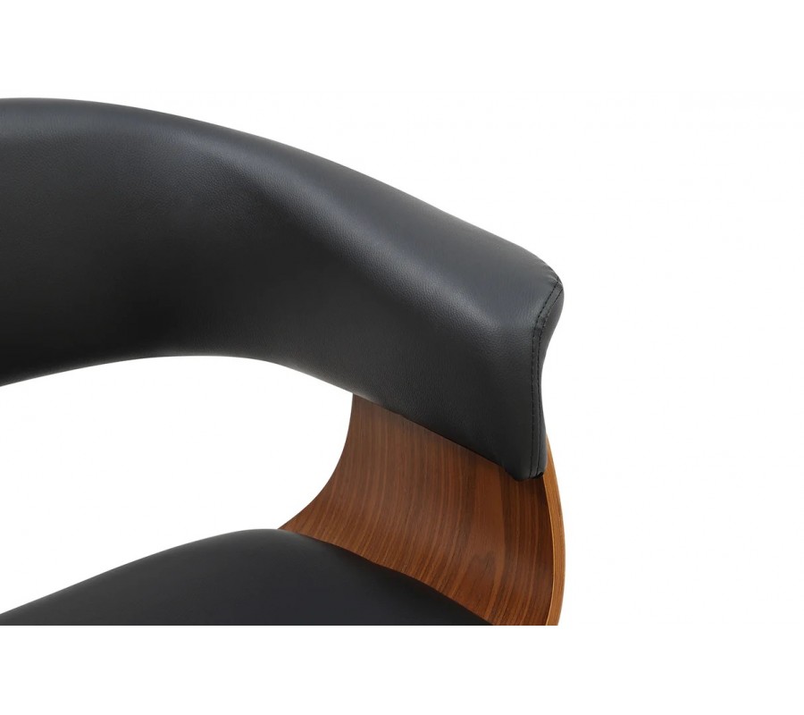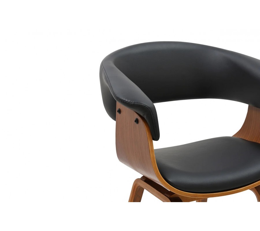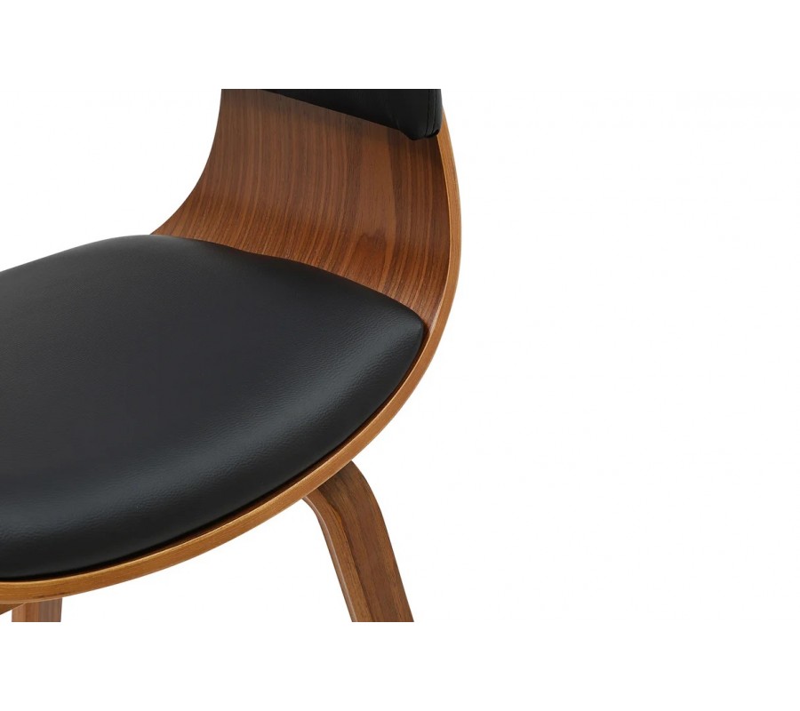 Jedálenská stolička Ecco prinesie do vašej domácnosti moderný dizajn a prírodný vizuál. Spojenie orechovej hnedej farby dreva s čiernou kožou pôsobí sofistikovaným dojmom a unikátna silueta z nej robí nielen funkčný, ale aj vizuálne atraktívny doplnok miestnosti.