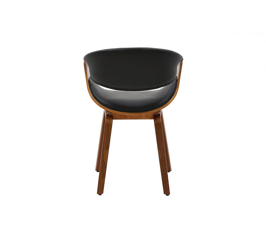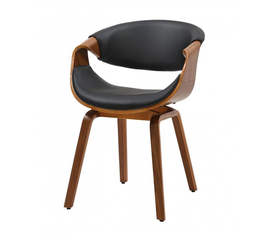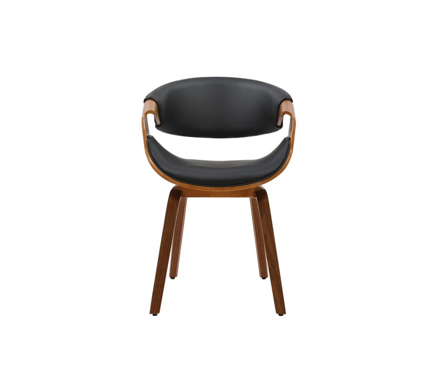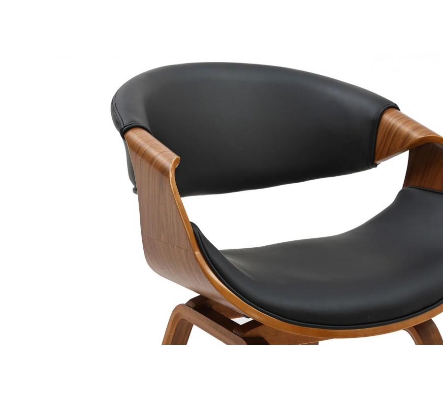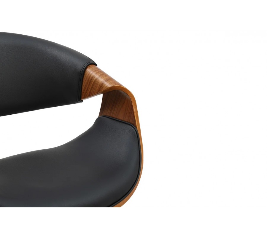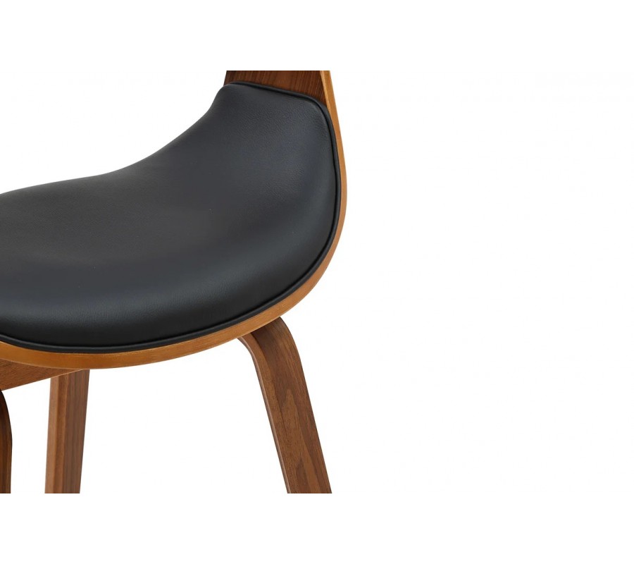 Konštrukcia stoličky je vyrobená z dyhovaného dreva v bohatej orechovej hnedej farbe. Prirodzená kresba letokruhov zvýrazňuje originálne tvary a zároveň dodáva nábytku teplý prírodný vizuál. Sedadlo a opierka sú čalúnené, s poťahom z ekoože s hladko brúseným povrchom. Čierna farba vytvára elegantný kontrast k drevu.