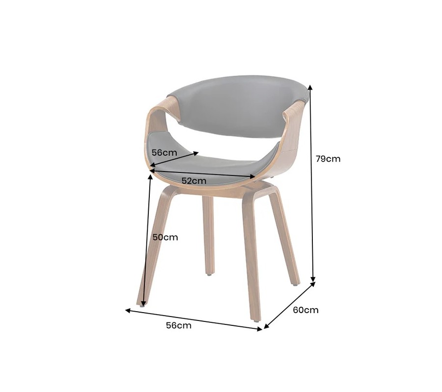 Jedálenská stolička má prehnuté sedadlo, ktoré prechádza do vyvýšených bočných strán. Tie sú vo vrchnej časti tvarované do výrazného dynamického ohybu, plynule prechádzajúceho do chrbtovej opierky v tvare U. Elegantné krivky vytvárajú neprehliadnuteľnú siluetu inšpirovanú retro štýlom. Voľný priestor medzi sedadlom a opierkou pôsobí vzdušným dojmom no zároveň poskytuje kvalitnú oporu tela.