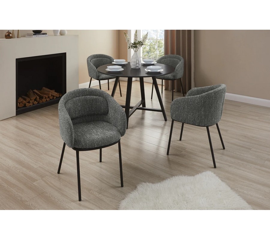 Sivé tóny poťahu výborne dopĺňajú čierne matné nožičky. Sú vyrobené z kovu a zošikmené línie zaručia stoličke výbornú stabilitu. Ich dlhý štíhly valcovitý tvar vyvažuje mohutnú vrchnú časť a dizajn tak pôsobí odľahčene a vzdušne.